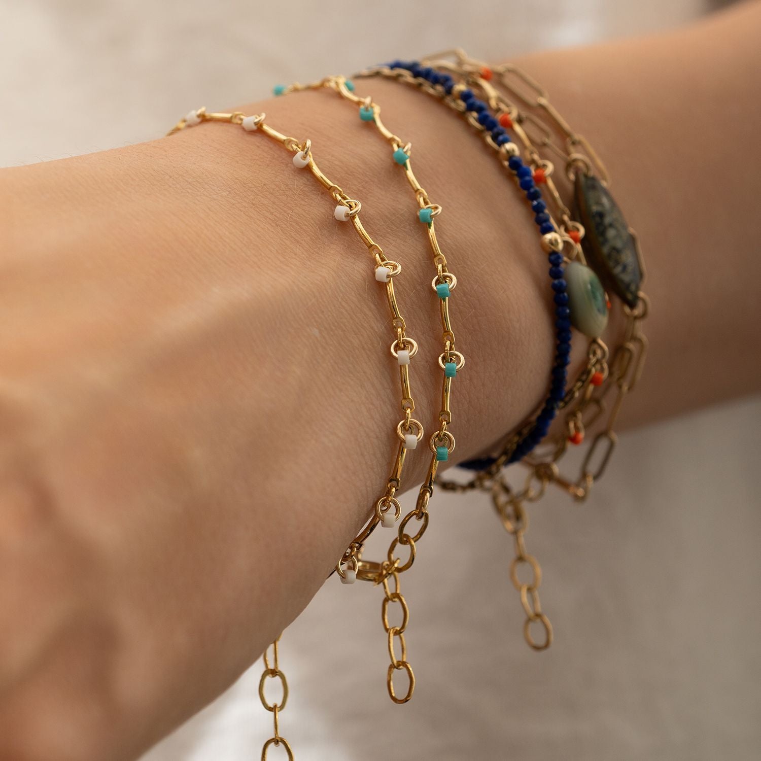 This bracelet is made of a 14K gold-filled chain and features pearl-white Japanese seed beads. It is lightweight, water-resistant, and safe for sensitive skin.