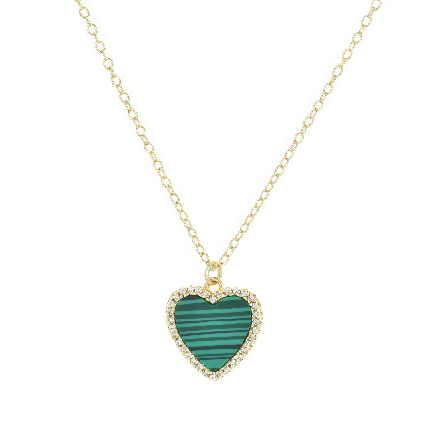 This necklace is set in 925 sterling silver with a gold plating. It features a lab-created malachite heart surrounded by crystals. The chain is adjustable from a choker length to 18 inches.