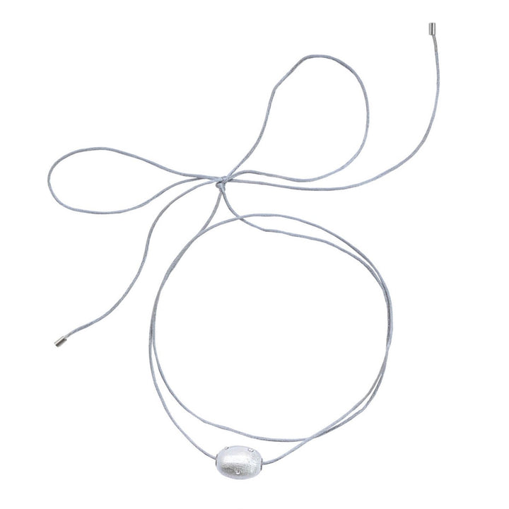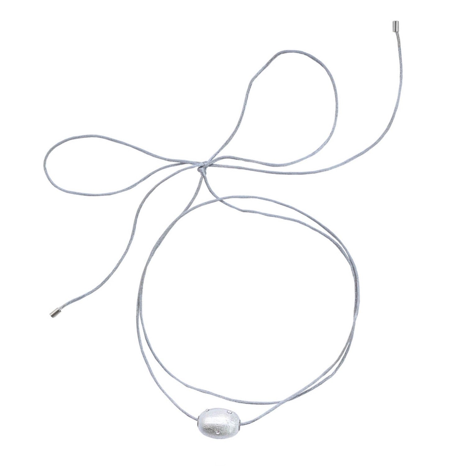This Lily Tie Necklace by Saule Label in Jet Frost is a minimalist and delicate accessory with a magnetic charm. It features a hand-painted bead adorned with shimmering Austrian crystals, threaded onto a double-length satin cord. The soft and adjustable cord allows you to wear it in multiple ways—knotted, bowed, or simply draped. Its understated simplicity makes it a versatile piece that complements any outfit with a touch of elegance.