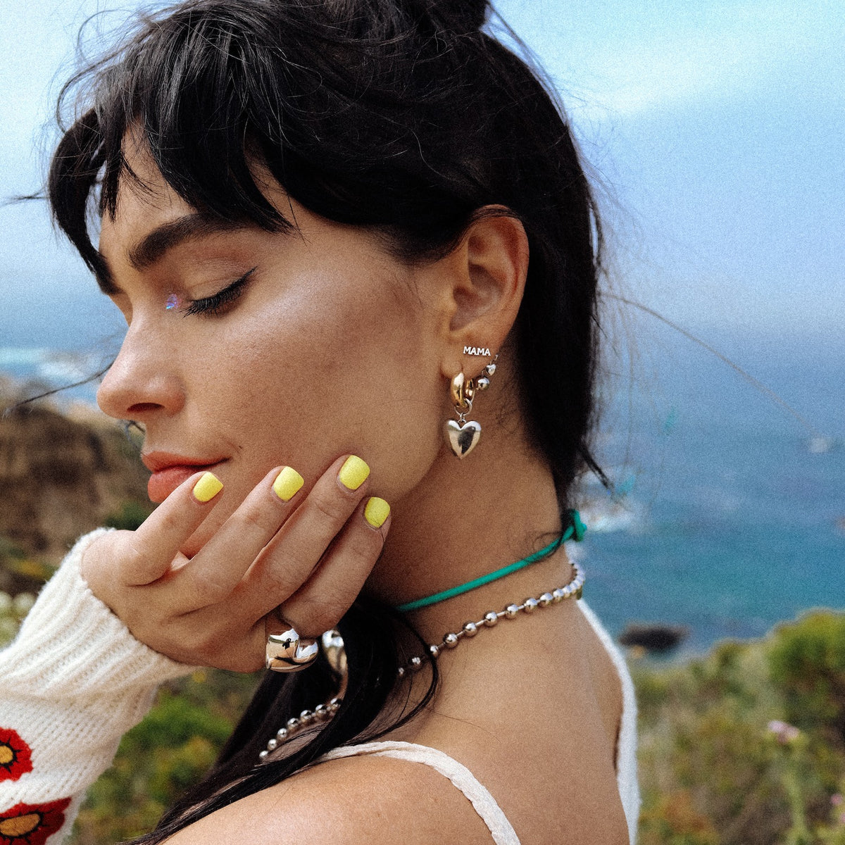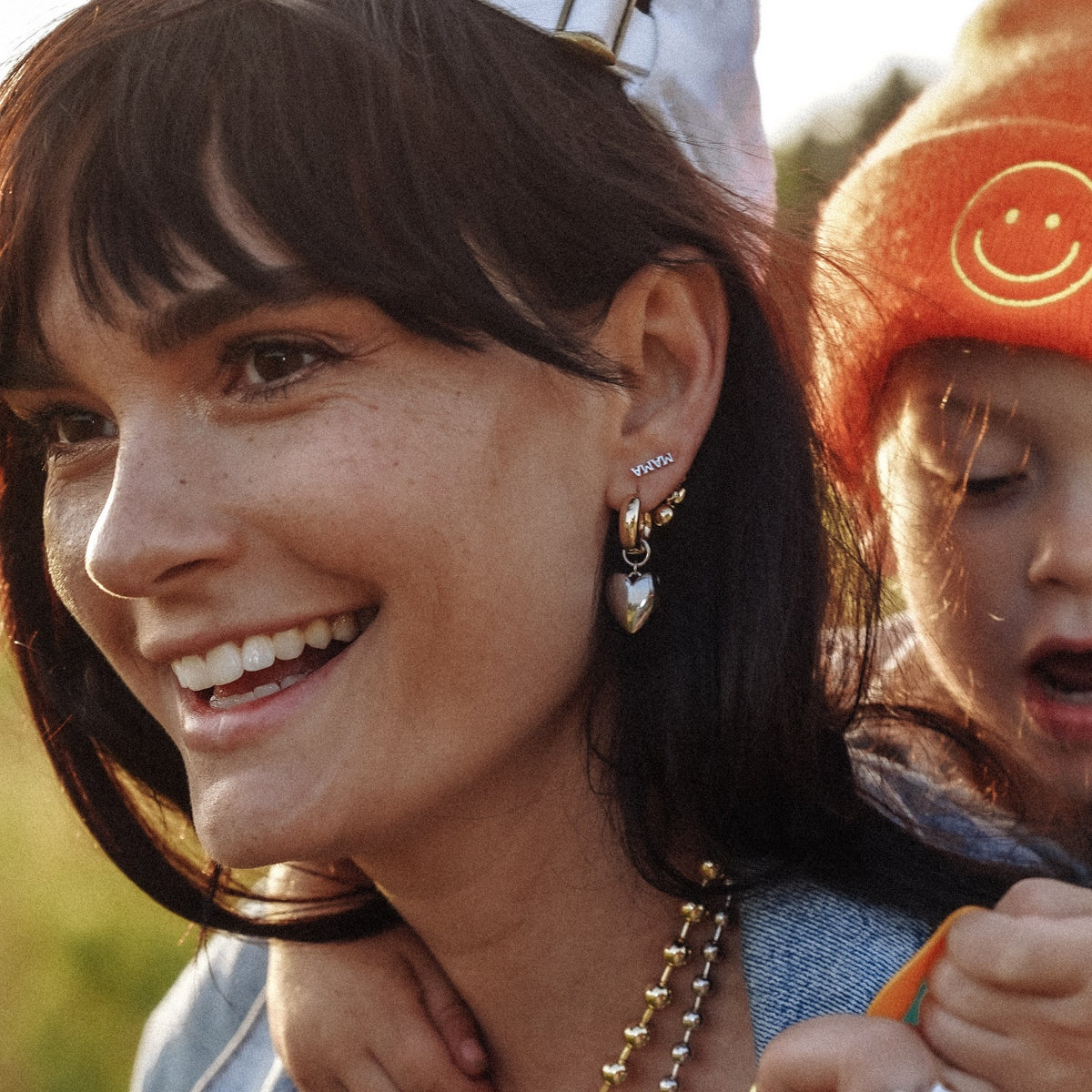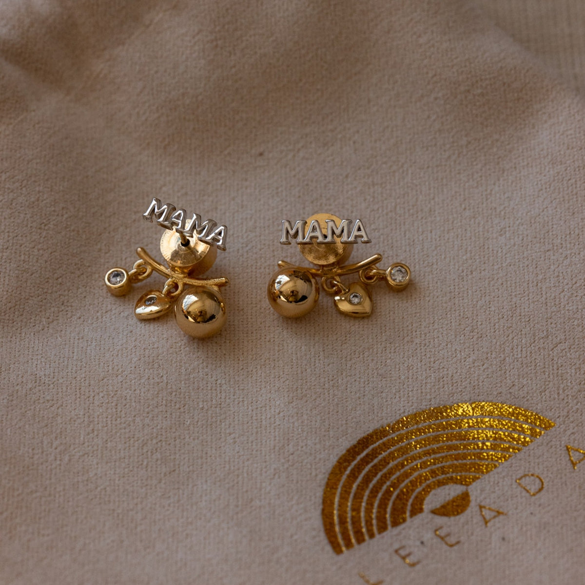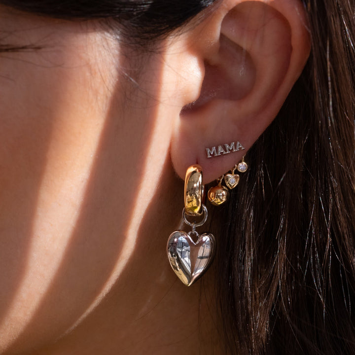 These earrings are made of 14k gold plated over brass. The charms include a Mama Word (10.5mm width x 2.5mm height), a Ball (6mm diameter), a Heart (4.5mm), and a Cubic Zirconia (3mm with a 1.5mm cz).