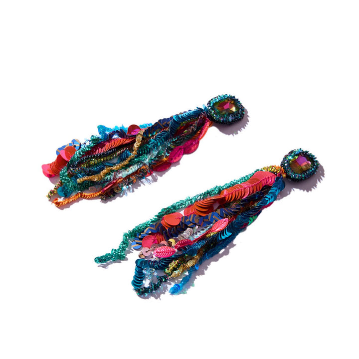 These Confetti Cascade Earrings by Simitri are a joyful explosion of color and movement. Handcrafted in India, these earrings feature a vibrant mix of multicolored sequins, beads, and metallic threads that cascade from a radiant crystal stud. The design is a full-spectrum celebration of energy and fun, perfect for adding a whimsical, high-impact statement to any look. They are ideal for a party, a festival, or any occasion where you want to turn a moment into a carnival.