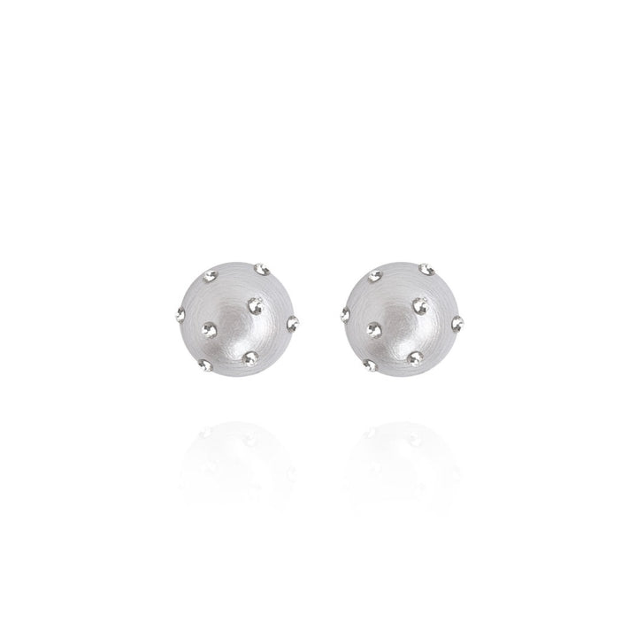 The Gaia Jet Petite Earrings In Cloudy Sky by Saule Label are a subtle yet sparkling take on a classic design. These petite stud earrings feature a delicate dome shape with shimmering Preciosa® Crystals on a wood base. Inspired by the essence of the earth, they offer a touch of sparkle without overpowering the look. They are handmade and are perfect for adding a sophisticated edge to everyday elegance.