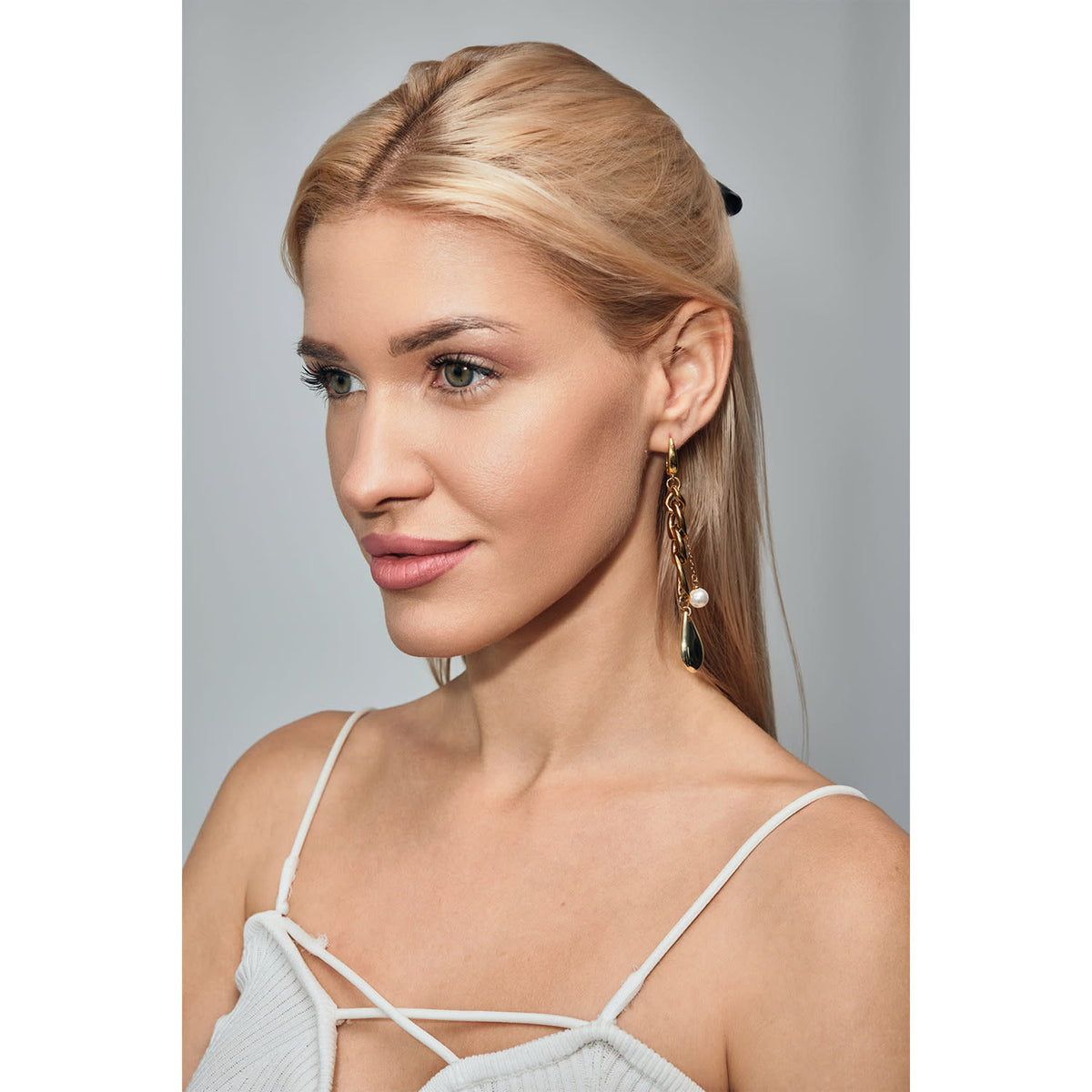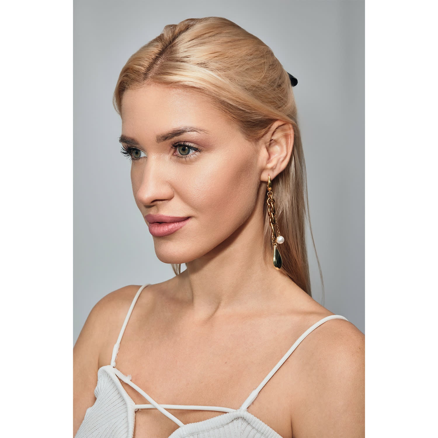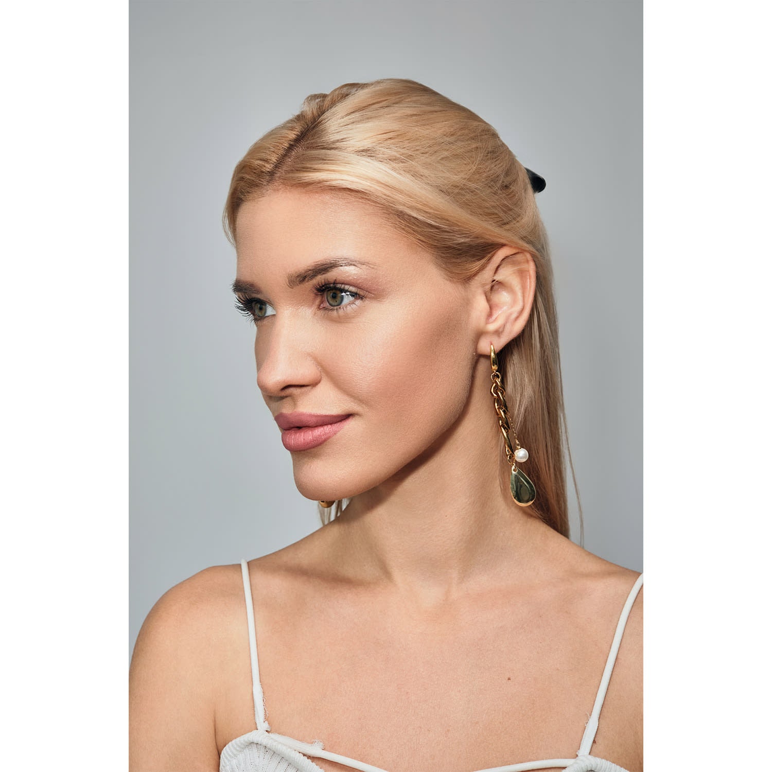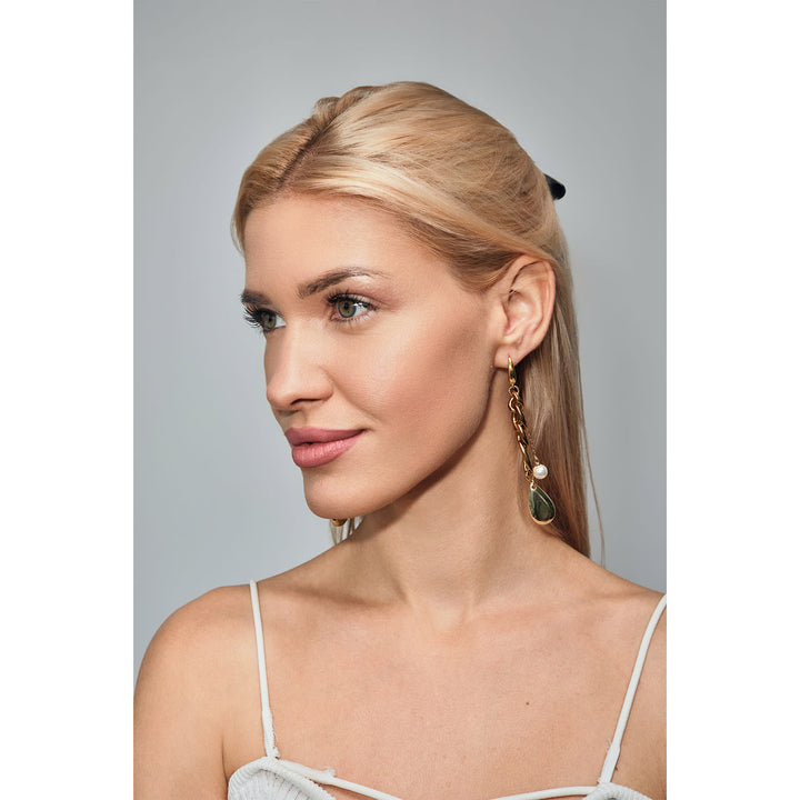 These Lumen Gold Earrings by My Mokondo are a bold statement piece, designed to stand out with their unique blend of edgy and elegant elements. The chunky chain links are beautifully complemented by delicate pearl accents and sleek teardrop charms that catch the light with every move. This combination creates a dynamic and sophisticated look, perfect for those who want their accessories to shine as brightly as they do. These earrings strike the perfect balance between modern boldness and classic refinement.