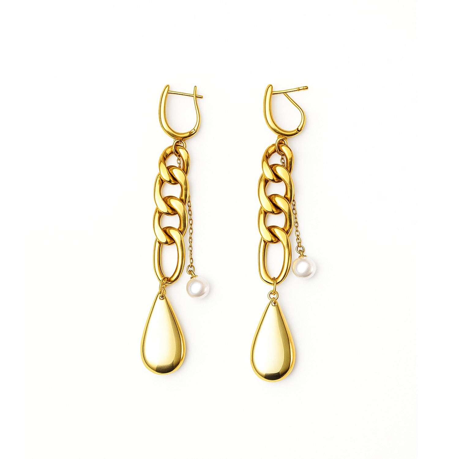 These earrings are crafted from metal with a gold finish, and feature chunky chain links, delicate pearl accents, and sleek teardrop charms.