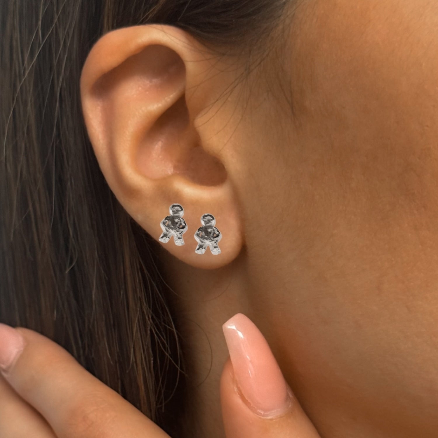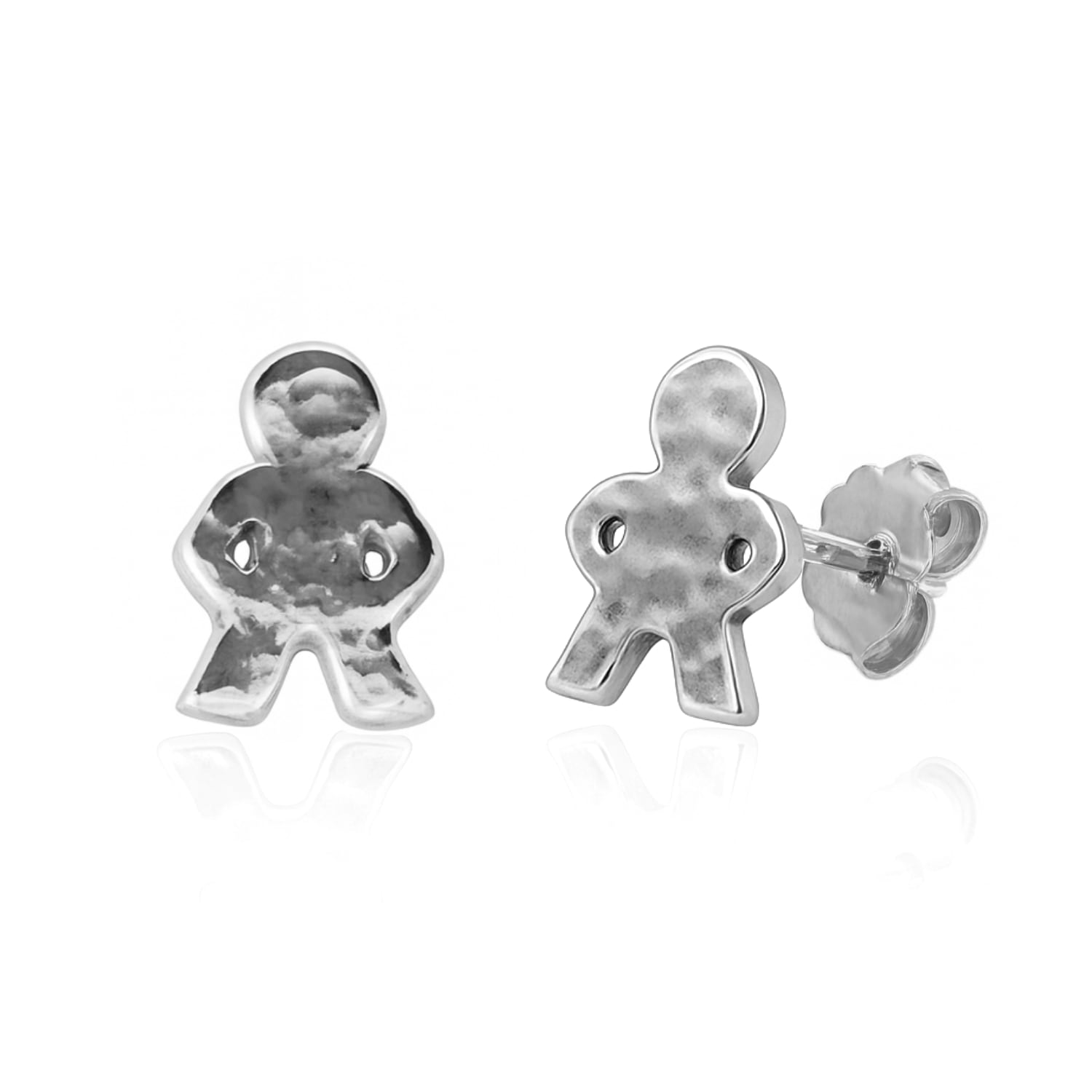 These Hammered Sterling Silver Boy Earrings by Unaloe are a tender tribute to family and love. Sculpted with delicate detail and finished in a hammered texture, each earring depicts a boy figure, symbolizing bonds of affection and protection. Compact yet meaningful, they can be worn alone or layered with other Unaloe creations, offering both symbolic resonance and versatile style. With their artisanal antiqued finish, they carry the soul of true Italian craftsmanship.