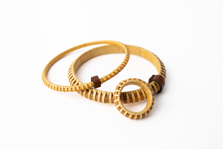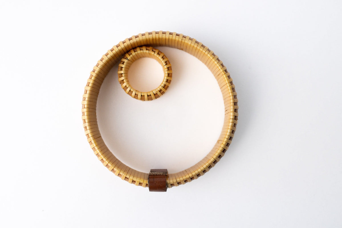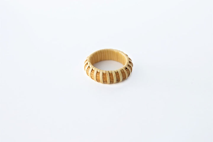 This ring is inspired by a single stave Nantucket basket. The material is not specified, but it should be kept away from water and chemicals.