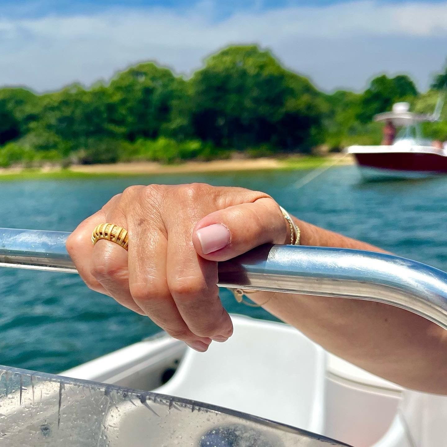 This The Deckhand Ring by Whale Tail Weaving is a unique and rustic ring with a handcrafted design, inspired by a single stave Nantucket basket. The ring has a charming, woven-like appearance that gives it a distinct and personal feel. This piece is perfect for those who appreciate artisan craftsmanship and a style that is both simple and meaningful. The rustic design and handcrafted nature make it a versatile accessory that can be worn daily as a subtle reminder of a connection to the sea and traditional crafts.