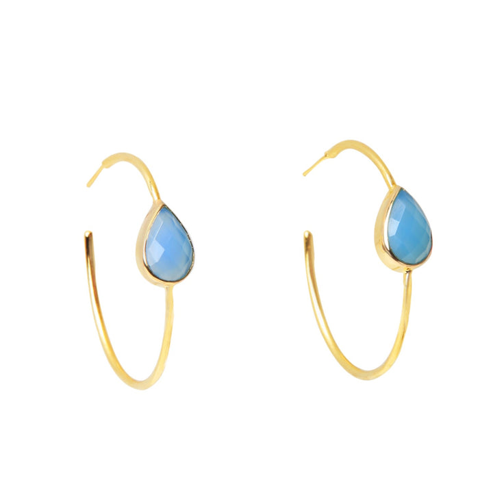 These earrings are made from 24k gold-plated brass metal and feature a faceted blue chalcedony stone.