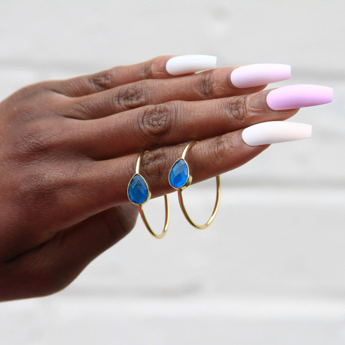 These Spring Life Blue Gemstone Hoop Earrings by Yaa Yaa London are a subtle yet stunning accessory perfect for adding a touch of color to your style. The simple gold-plated hoops are elevated by a faceted blue chalcedony stone, creating a classic-meets-bohemian vibe that can be worn with literally anything. Their lightweight and comfortable design make them a perfect choice for all-day wear, adding a beautiful pop of color that is both elegant and eye-catching.