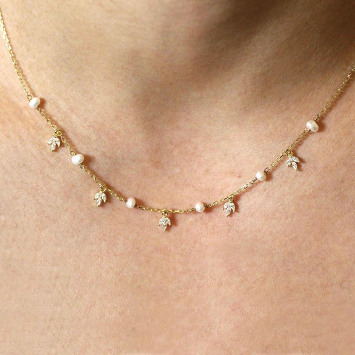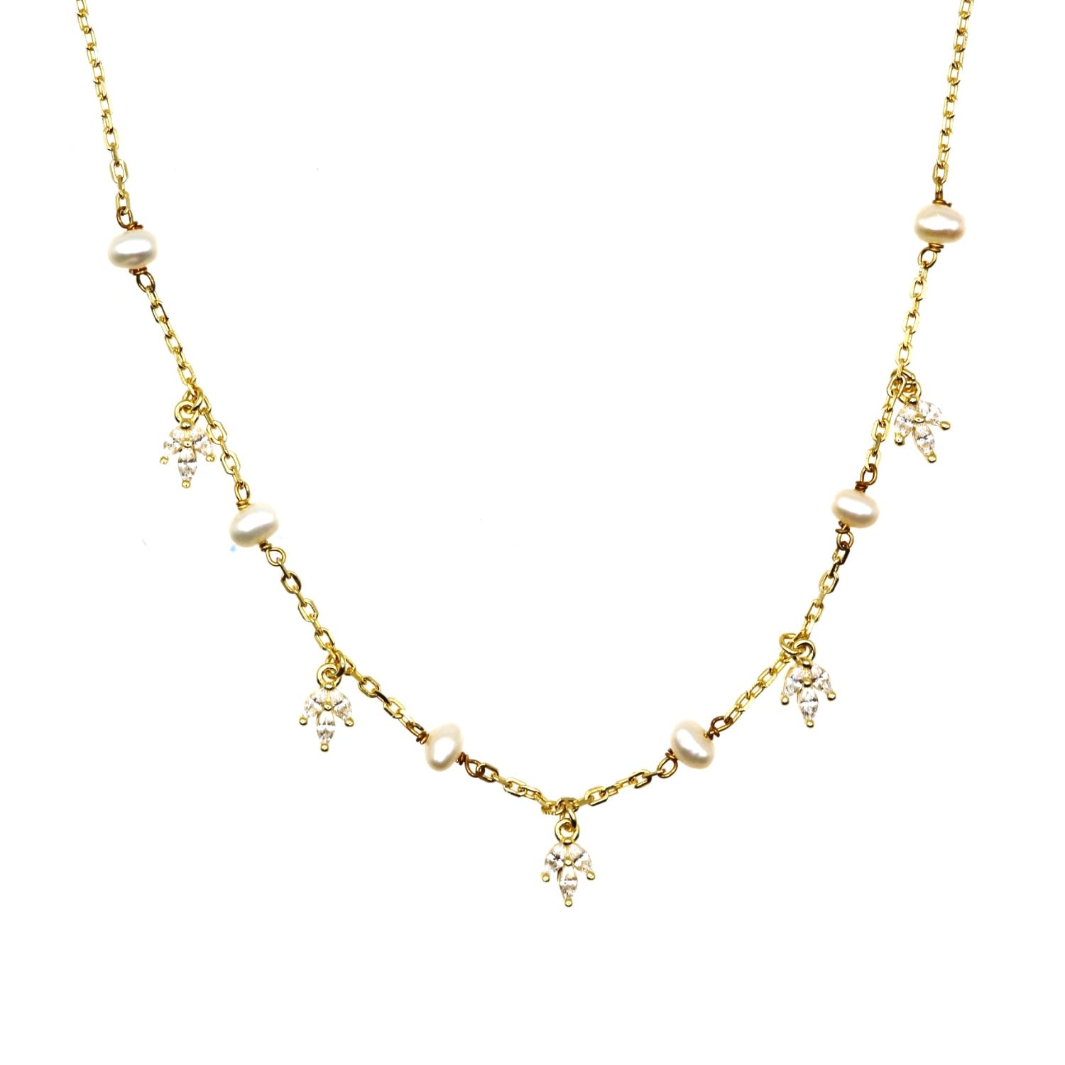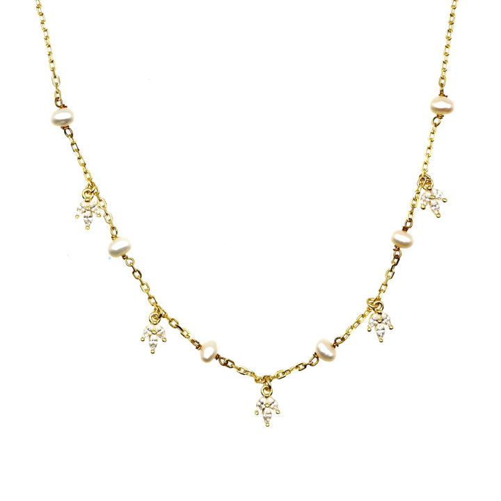 This necklace is made of Sterling Silver with 14k Solid Gold Filled. It features pearl dangle charms with Cubic Zirconia. It is 16" long with a 2" extender.