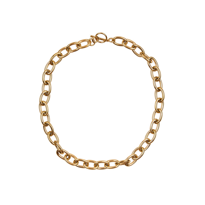 This necklace is made of high-shine links and is 18k gold-plated on stainless steel.