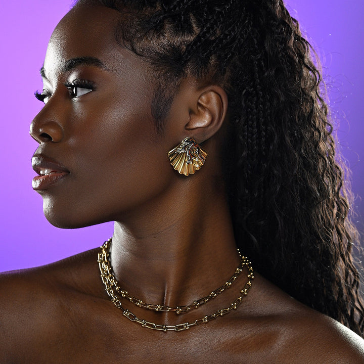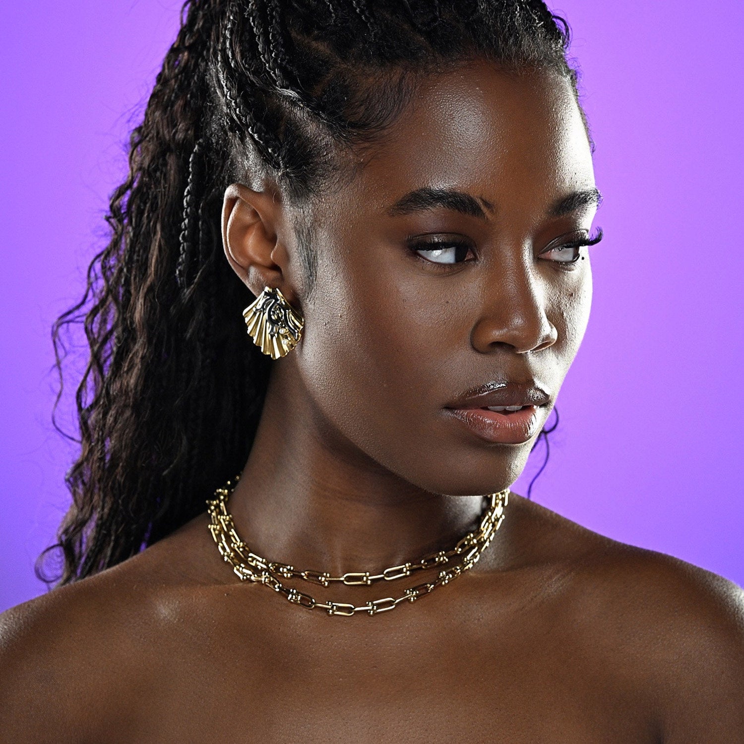 Golden Rhythm Necklace by Superdivajewellery is a lightweight and eye-catching accessory. Inspired by the vibrant energy of Jamaican music, this necklace features elongated chain links adorned with delicate golden orbs that reflect movement and rhythm. It is perfect for layering with other pieces or as a standalone statement piece, adding a layer of effortless elegance to any outfit, from casual wear to elevated looks.