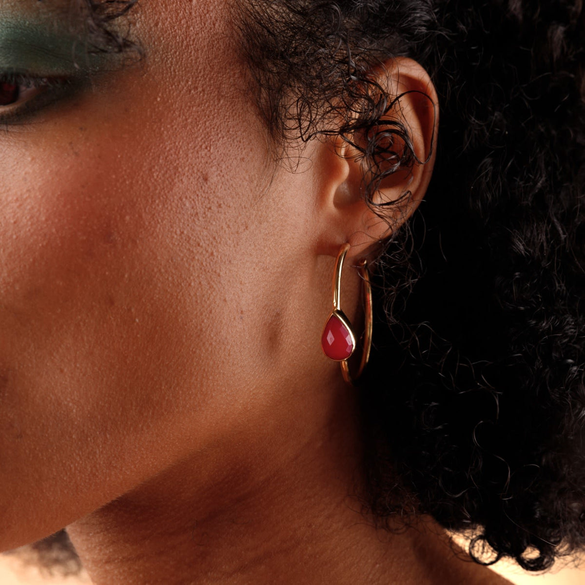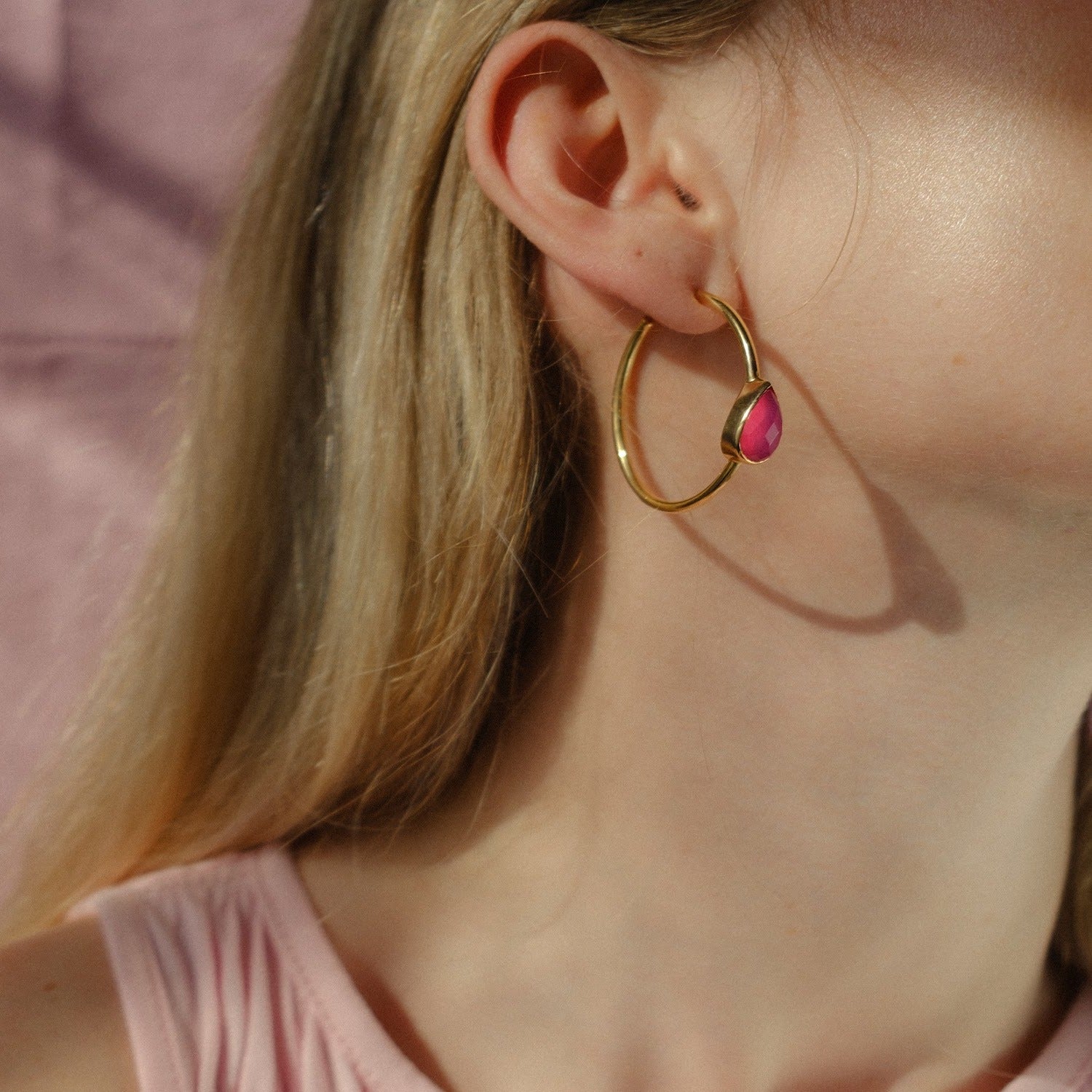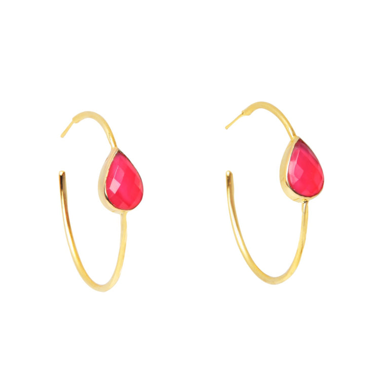 These hoop earrings are crafted from a brass metal base with 24k gold plating. They feature a faceted hot pink chalcedony stone.