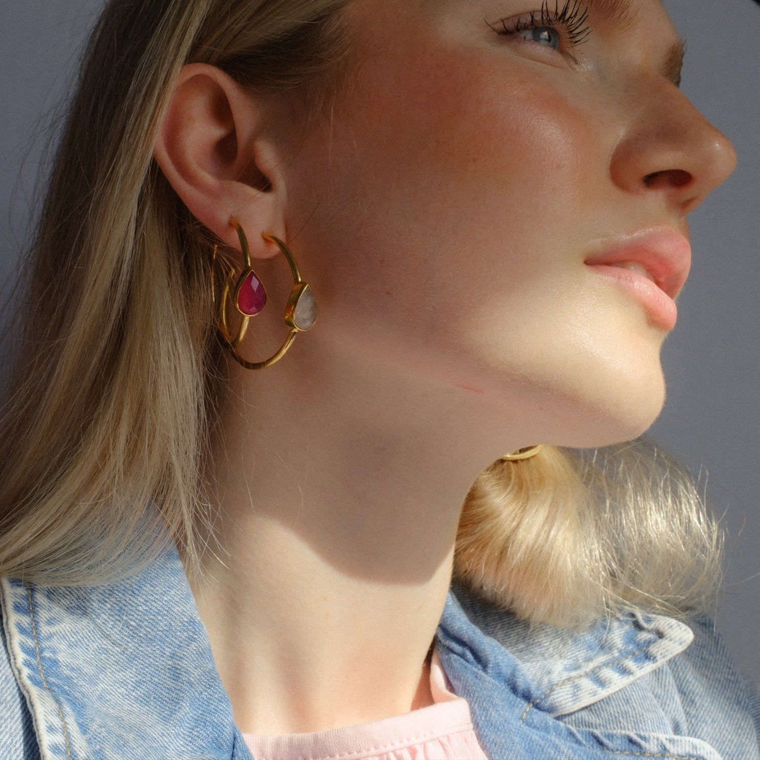 These Spring Life Hot Pink Gemstone Hoop Earrings by Yaa Yaa London are a subtle yet stunning accessory designed to brighten your style. These lightweight gold-plated hoops feature a beautifully faceted hot pink chalcedony stone that adds a vibrant pop of color. The classic hoop design makes them incredibly versatile, perfect for wearing with virtually any outfit. These earrings embody a cheerful and comfortable elegance, making them a perfect treat for yourself or a loved one.