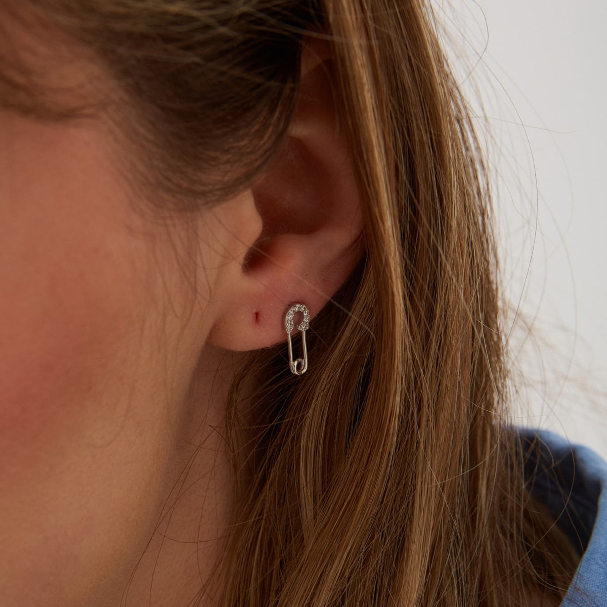 These earrings are cast in 925 recycled sterling silver and feature a safety pin design with zirconias. They have a post-back or butterfly-back lock.