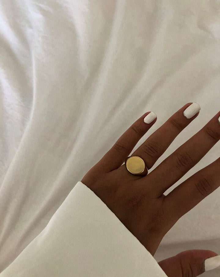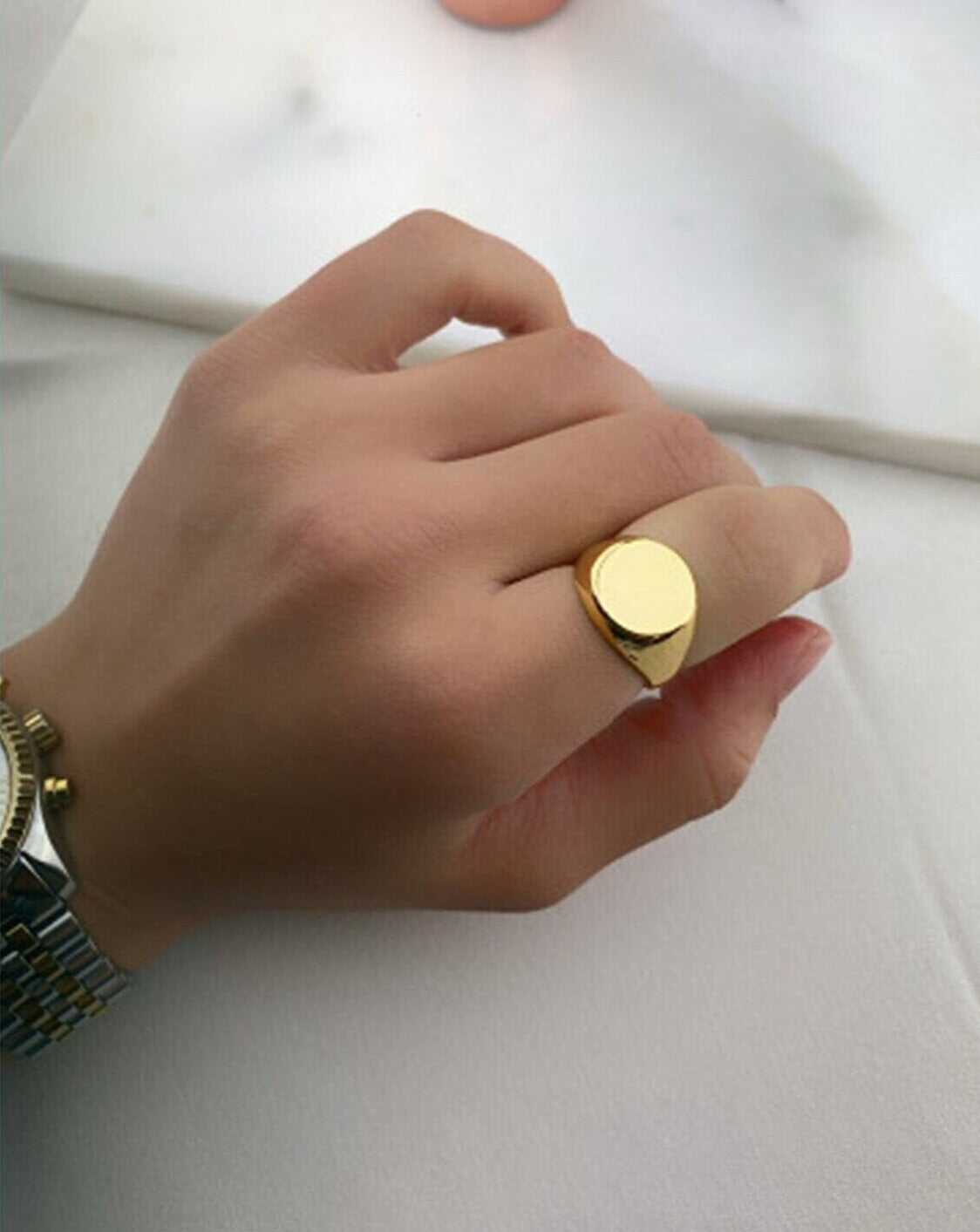 This adjustable ring is crafted from 925 recycled sterling silver. It features a round, geometric signet face and is available in rose gold, silver, and gold tones.