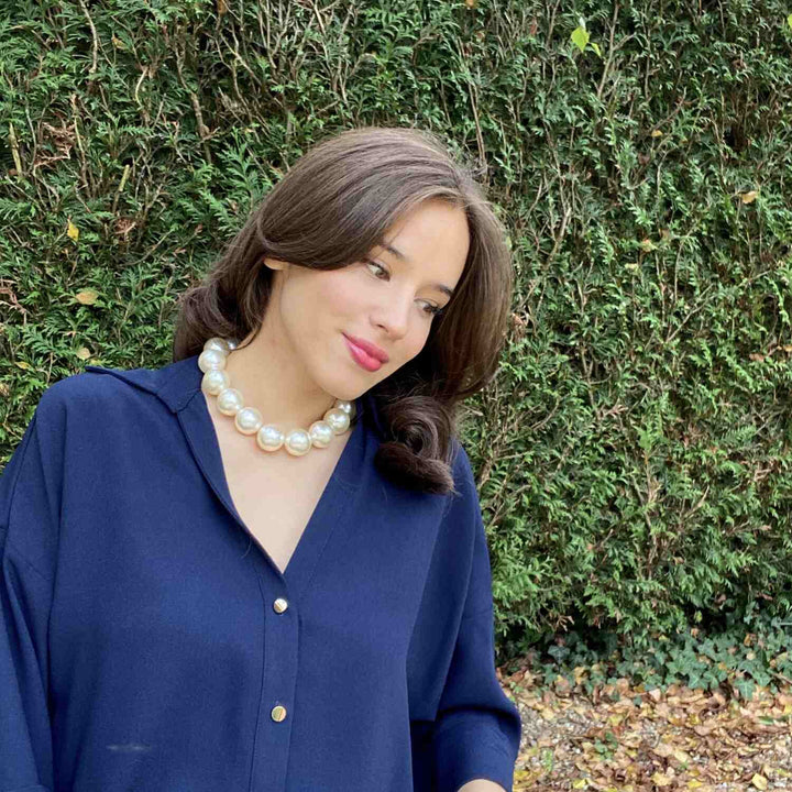 This Pearl Gumball Size Choker by Michael Nash Jewelry is a fabulous statement piece. The gumball-sized pearls add a bold touch of elegance to any outfit, from a casual t-shirt to a sophisticated evening ensemble. This necklace is a perfect accessory for those who love to make a grand entrance and showcase their personality.