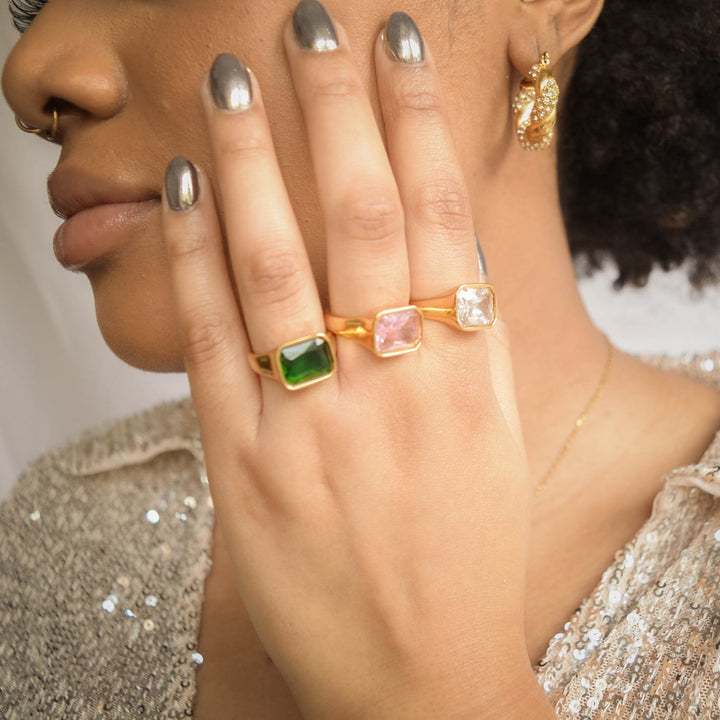 This ring is crafted from 18k gold stainless steel and features an emerald green cubic zirconia gemstone in a moon shape. It is tarnish-free.