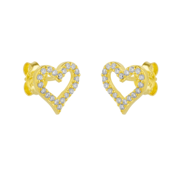 These stud earrings are handmade from 925 recycled sterling silver with a gold finish. They feature a heart shape and are set with cubic zirconias. They have a post-back or screw-back closure.