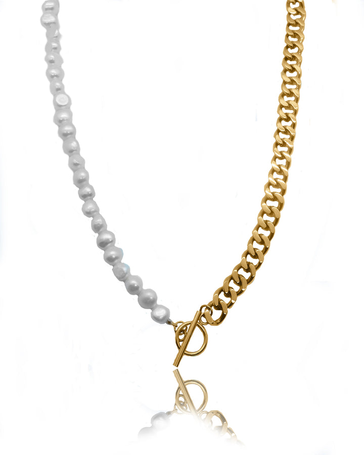The Blanche Fresh Water Oyster Pearl Cuban Chain Necklace by Viea is a versatile piece featuring half a curb chain and half freshwater pearls. This unique and modern design is enclosed with a toggle closure, allowing you to showcase the pearls, the chain, or both.