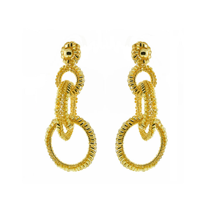 These All Gold Grace Handmade Crochet Earrings by Lavish by Tricia Milaneze shine with a rich interplay of craftsmanship and glamour. Interlinked forms are delicately hand-crocheted by Brazilian artisans using 18K gold-filled wire, resulting in a luminous design that is bold yet feather-light. Sparkling gold crystals and beads enhance their radiance, while the artisanal crochet technique ensures every pair is unique, carrying with it the artistry and dedication of its maker.
