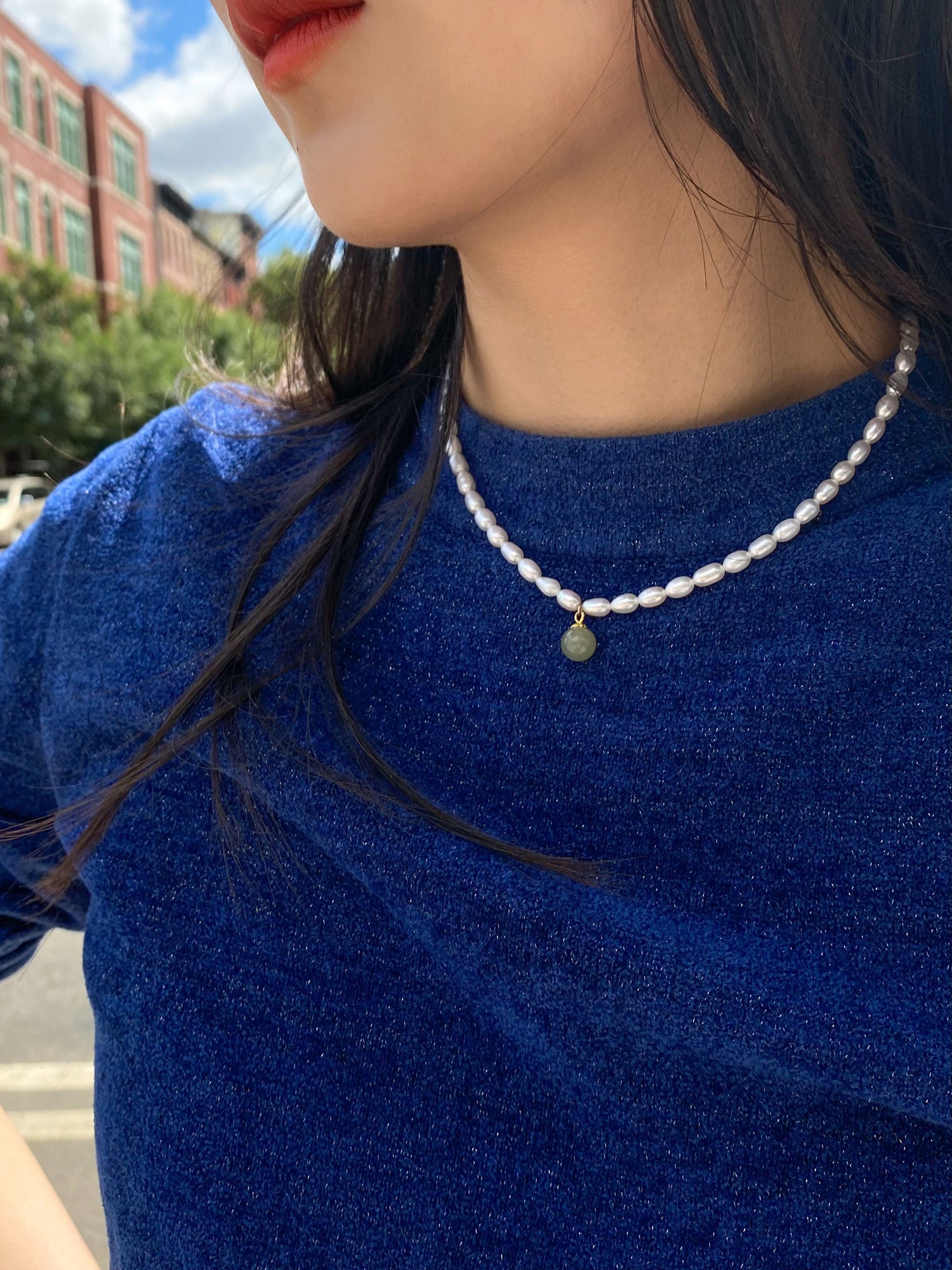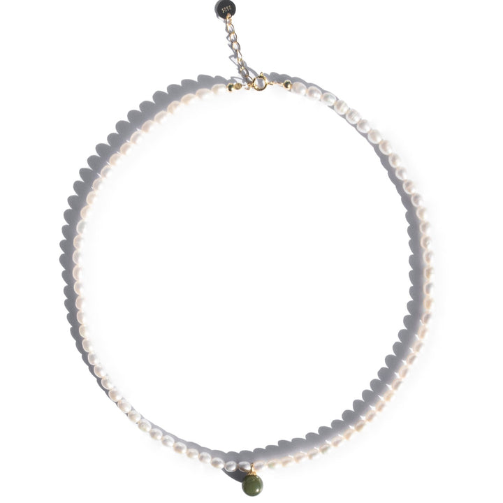 This choker is made with gold-plated S925 sterling silver adjustable chain with a length of 390-420mm. It features 2mm x 5mm freshwater pearls and a 7mm diameter nephrite jade pendant.