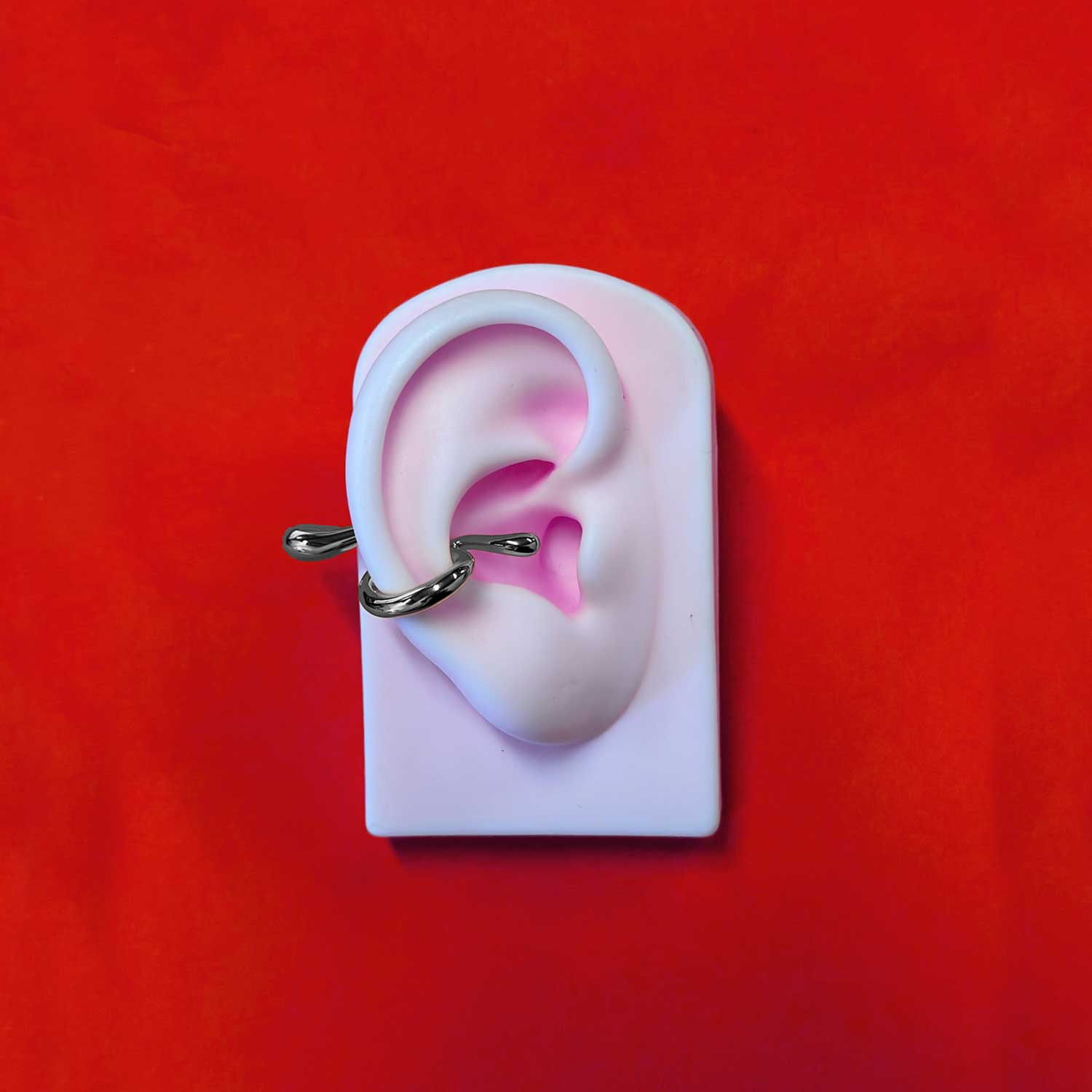 This mini ear cuff is crafted from a high-quality polished metal. It is designed to be worn without a piercing.