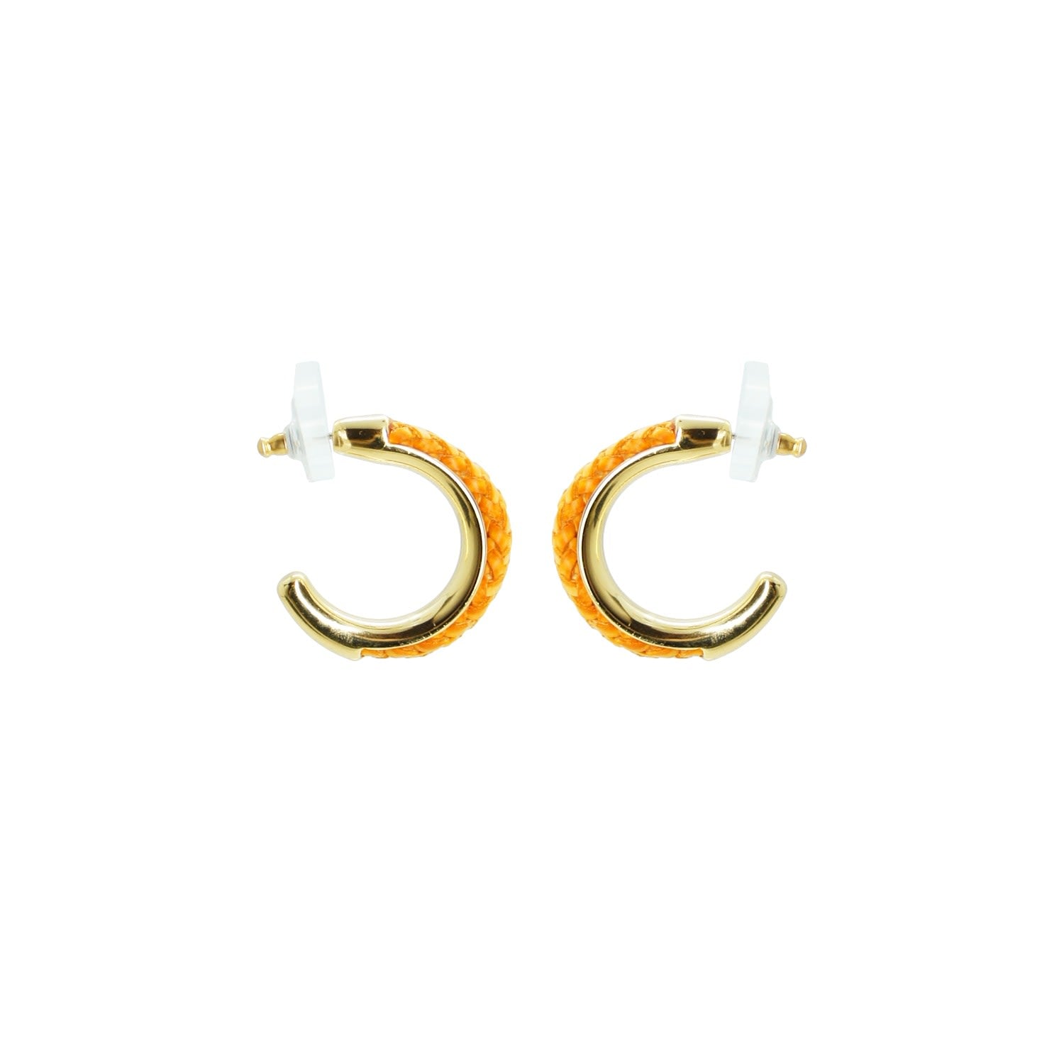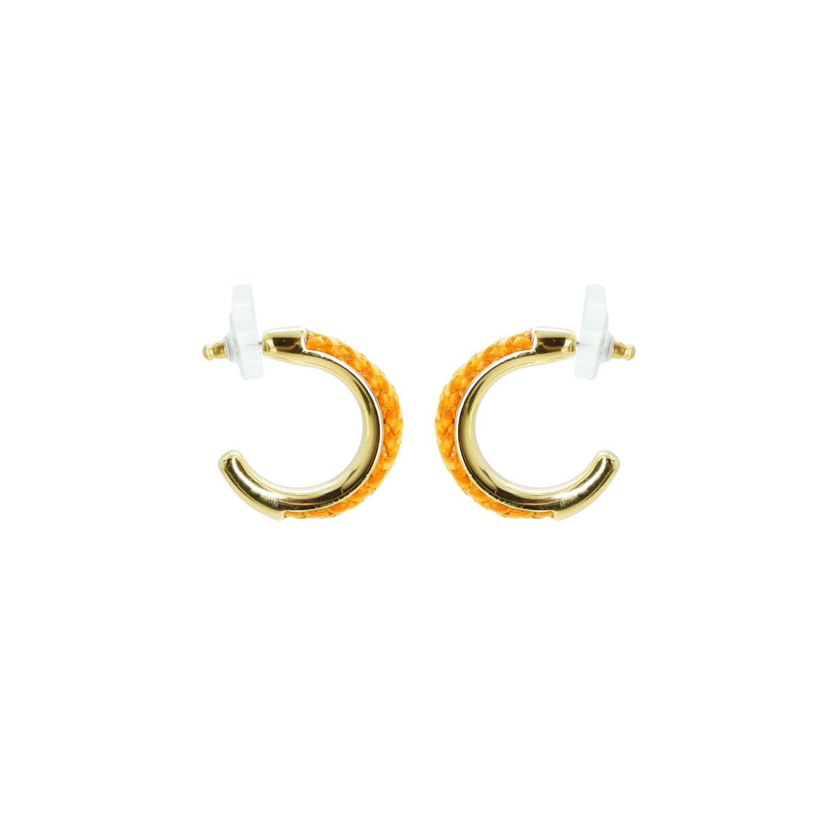 Handcrafted in Brazil, these hoop earrings are made with acrylic, braided leather, a golden finished zamak hoop, and a stainless steel pin.