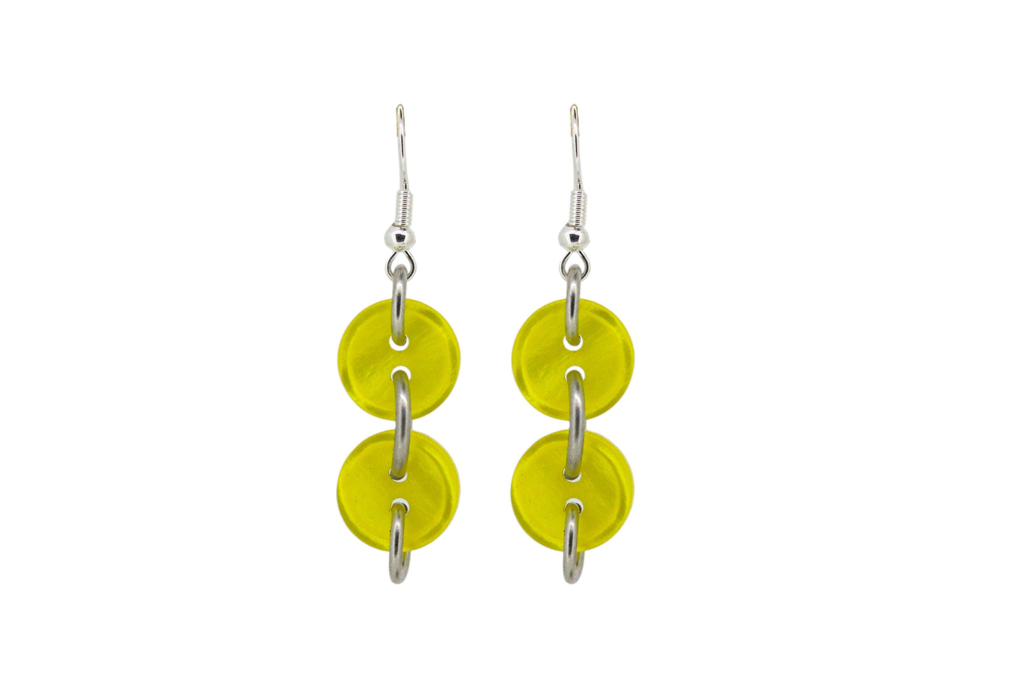 These earrings feature descending vintage yellow buttons. They are made from sterling silver-plated, nickel-free brass and have fishhook fastenings.