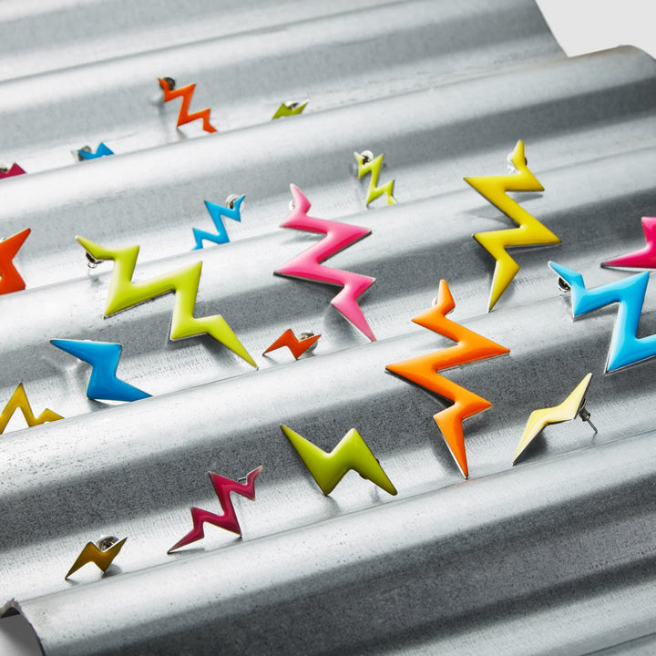 These Mini Bolts Stud Earrings by Toolally are designed to add a striking and energetic flair to your look. Their dark stainless steel construction, coated in a vibrant yellow enamel, creates a powerful and eye-catching contrast. Lightweight and versatile, these studs can be worn solo for a subtle "zap" or layered with other pieces from the Beats and Bolts collection to connect the circuit and intensify the flash. This design embodies a playful yet edgy aesthetic, perfect for adding a pop of rebellious color.