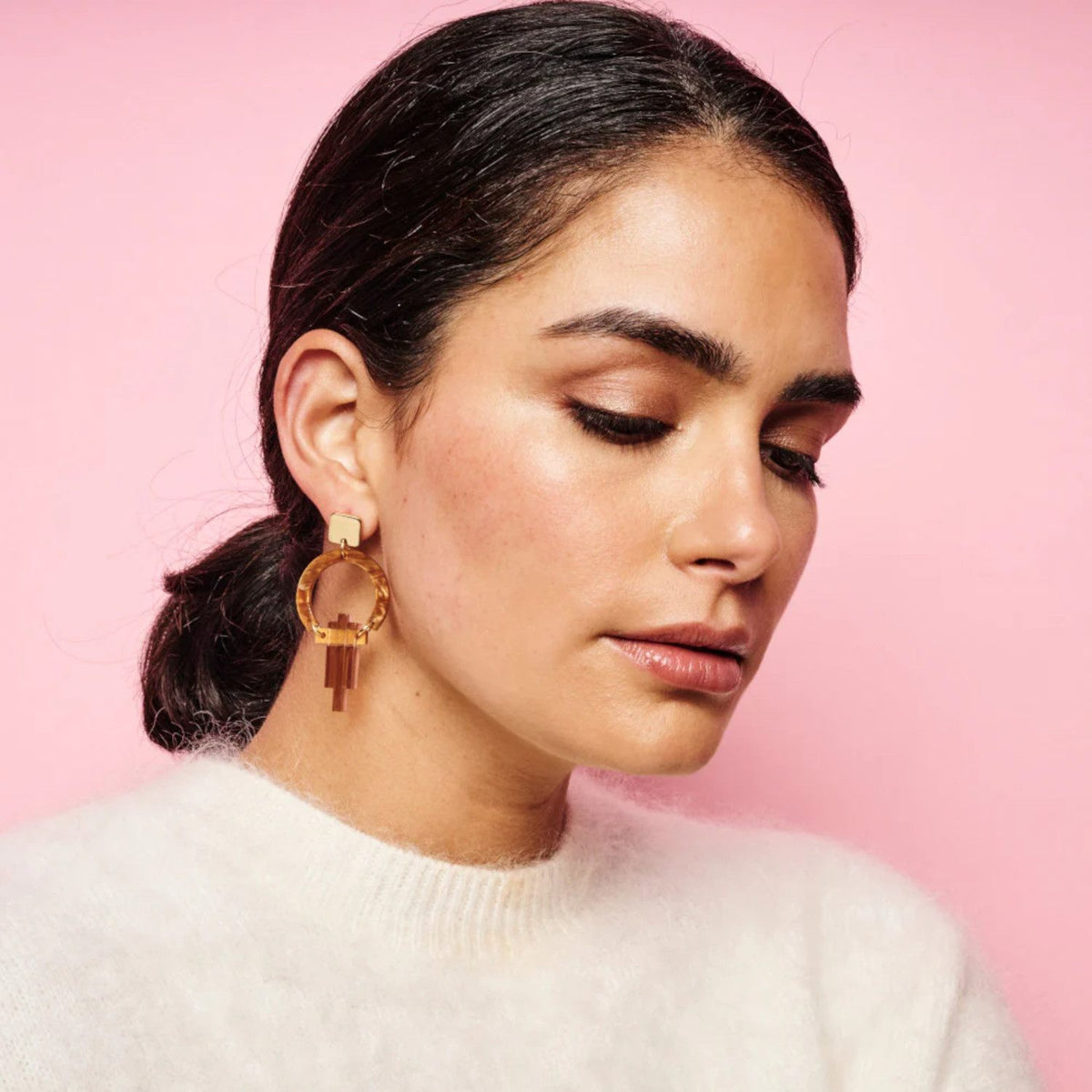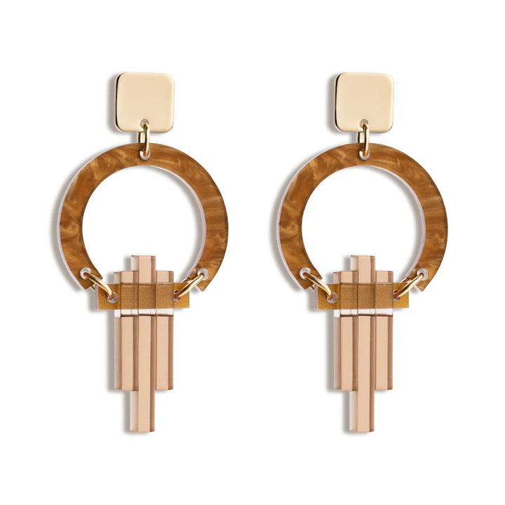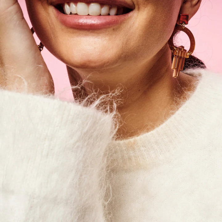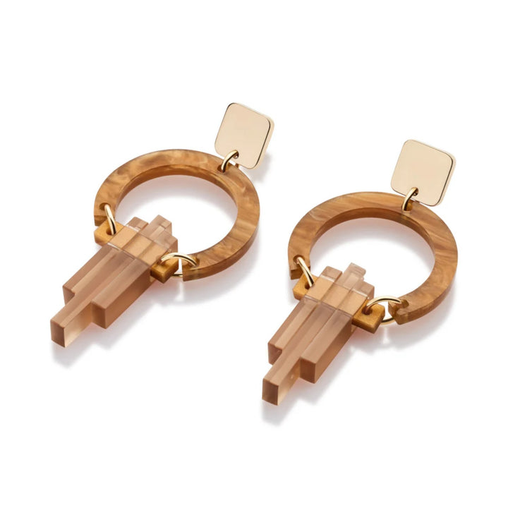 Acrylic and brass, crafted with artisanal techniques. Nickel-free with hypoallergenic fittings. Handmade in UK.
