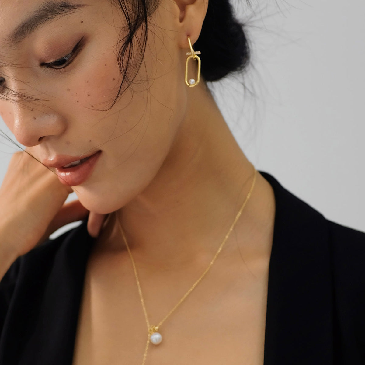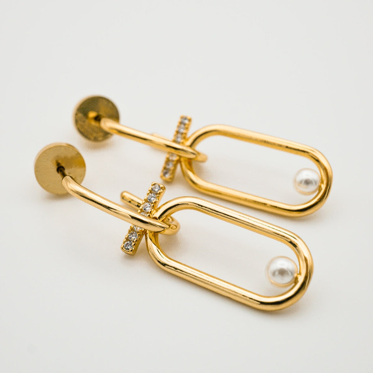 These earrings are made with 18K gold plated on brass or silver and feature pearl details. The gold plating is more than 2.5 microns thick.