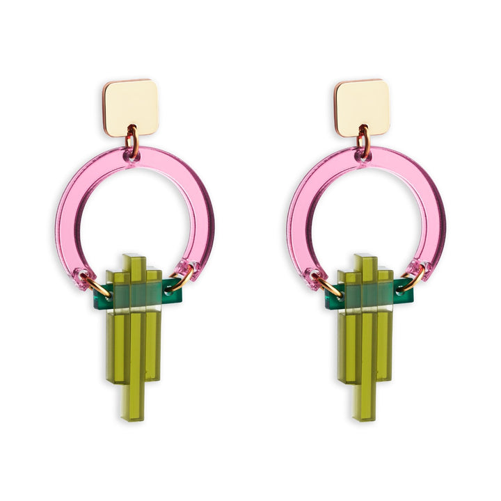 These earrings are crafted with pink mirror and lime zest materials. The gold ear tops are cast from solid brass, plated in 18ct gold, and finished with a surgical steel ear post.