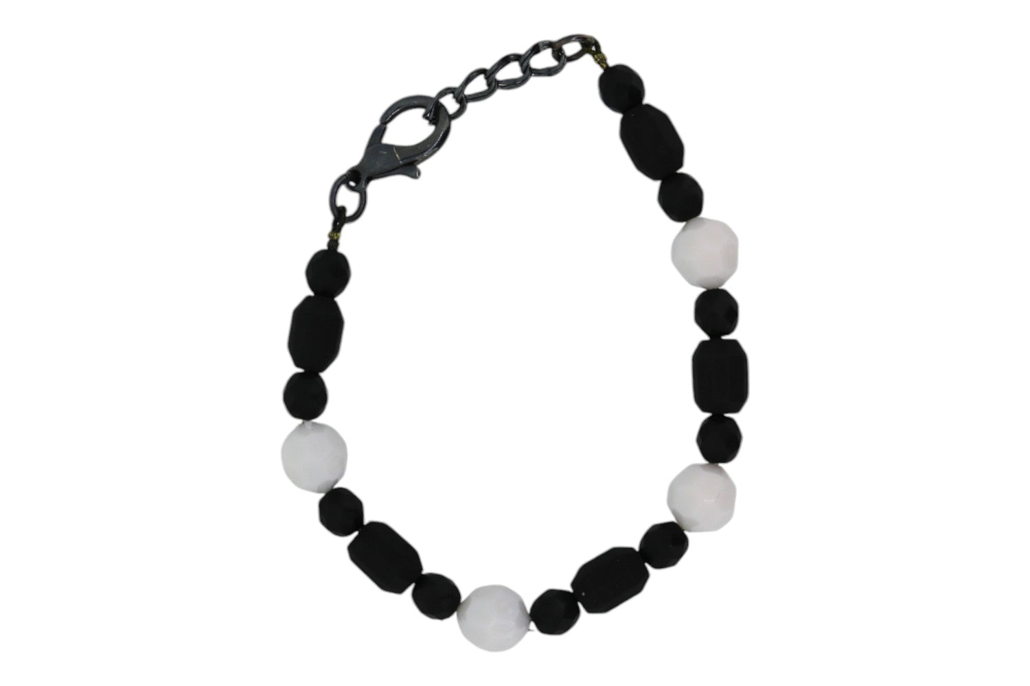 This bracelet is made with vintage theatre and ceramic beads and an Oxidised Sterling Silver plated clasp. It is one-of-a-kind.