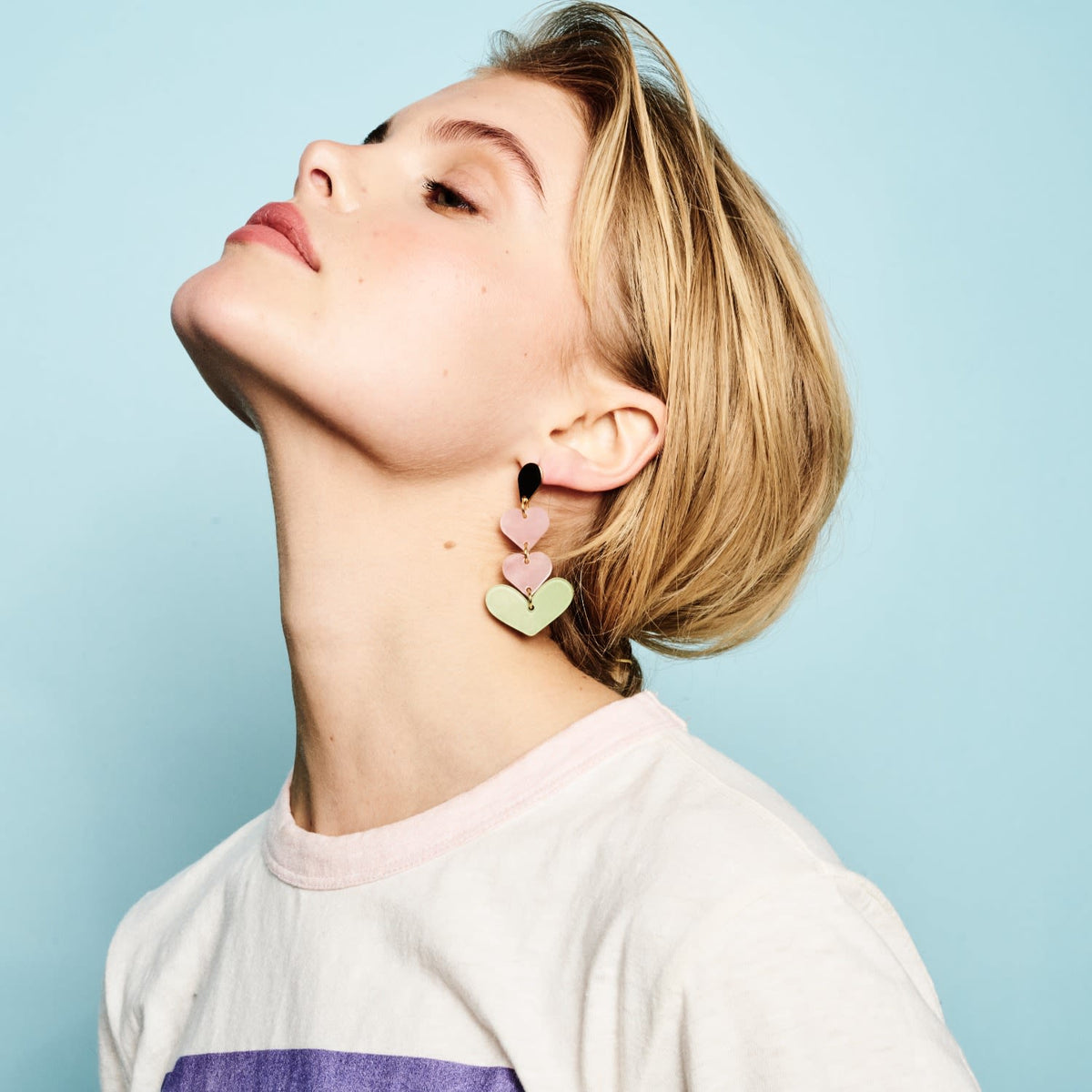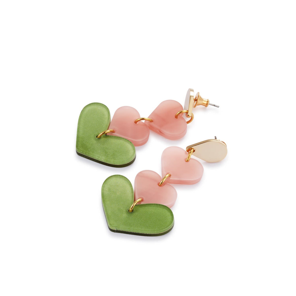 These Heart Drop Earrings - Pink And Green by Toolally are a delicate nod to romance, perfect for date nights or a casual weekend look. Featuring a playful heart motif, these earrings add a touch of romantic charm to any outfit. The design embodies a perennially popular motif that makes you feel good when you wear it. Crafted to the highest standards, these earrings are made to be loved forever and can be repaired to last a lifetime.