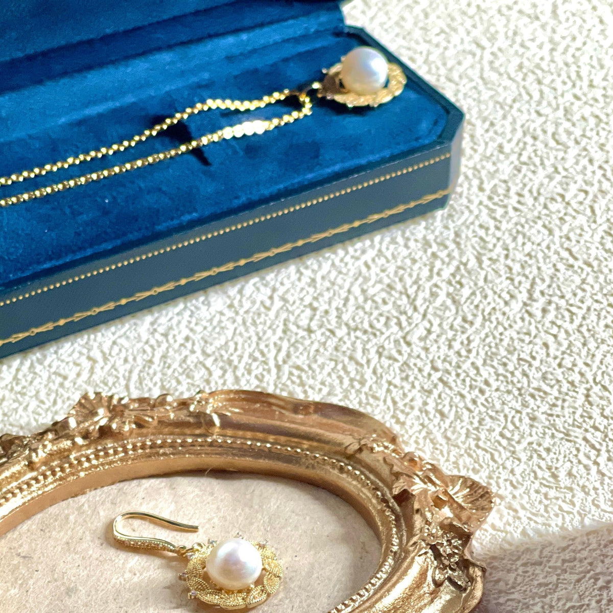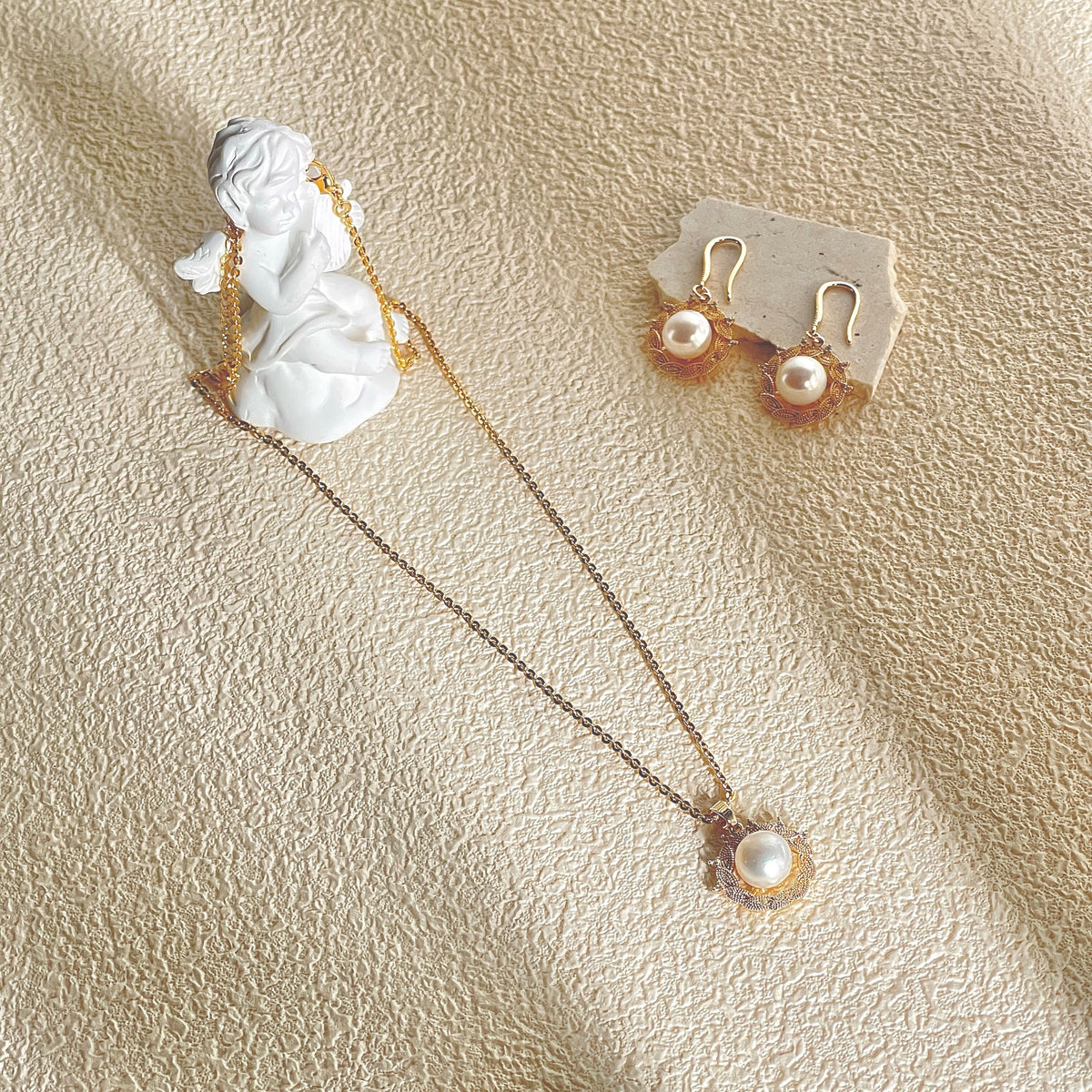 The Graceful Luster Pearl Necklace by Ninemoo is a timeless and captivating accessory that draws inspiration from moonlit nights. This necklace features a graceful luster with its pearl and zirconia composition. It is 18k gold-plated and can be paired with matching earrings for a coordinated look.