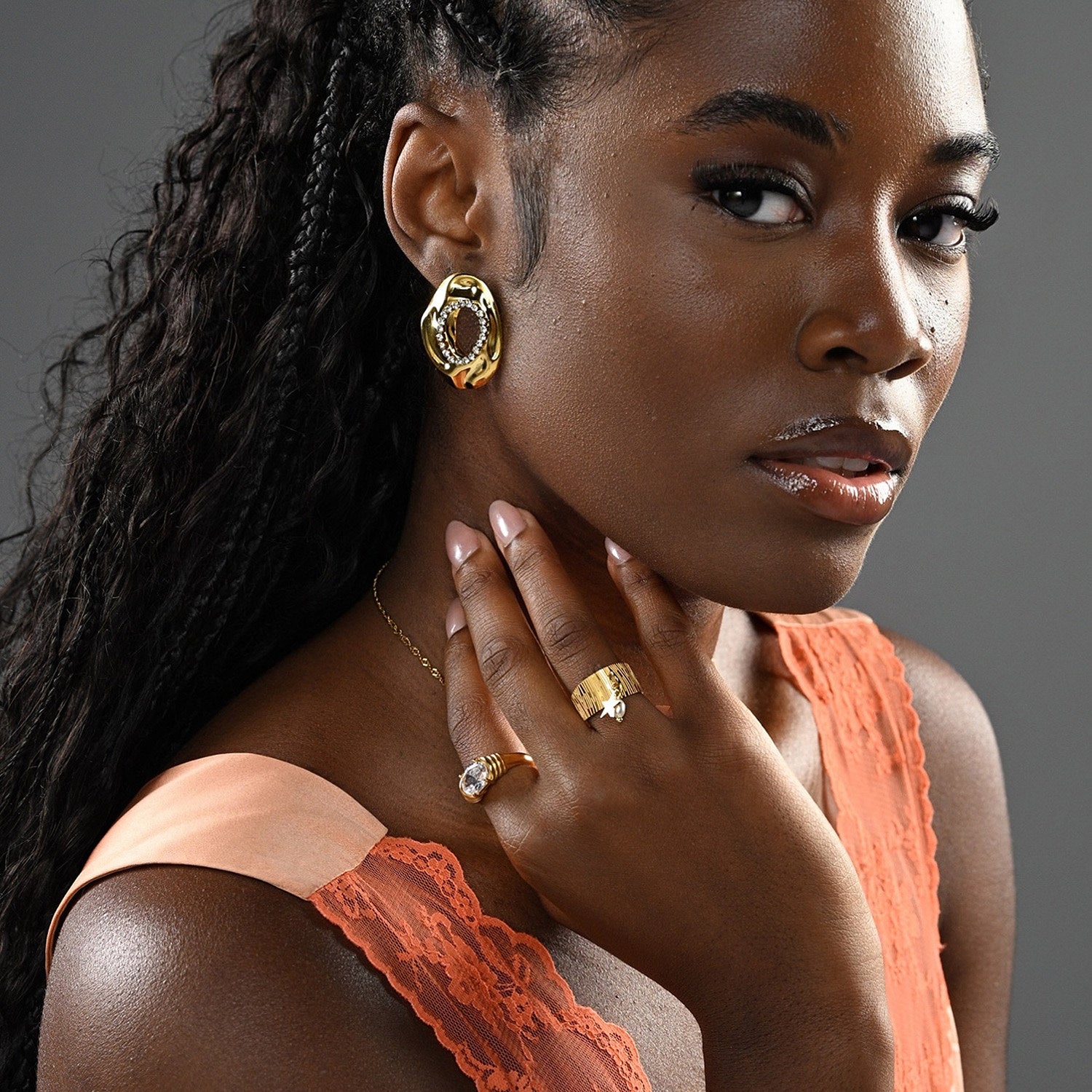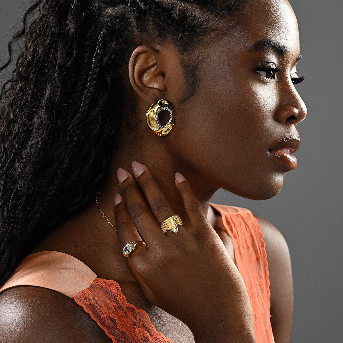 Gordon Earrings by Superdivajewellery are a bold and elegant statement piece inspired by the natural beauty and culture of Jamaica. Their sculptural, molten gold design creates a radiant and effortlessly stylish aesthetic. The central oval cutouts are lined with shimmering crystals, adding a touch of light that evokes the sun on the Caribbean Sea. Named after a family name that echoes strength, these earrings are designed to evoke warmth and island elegance.