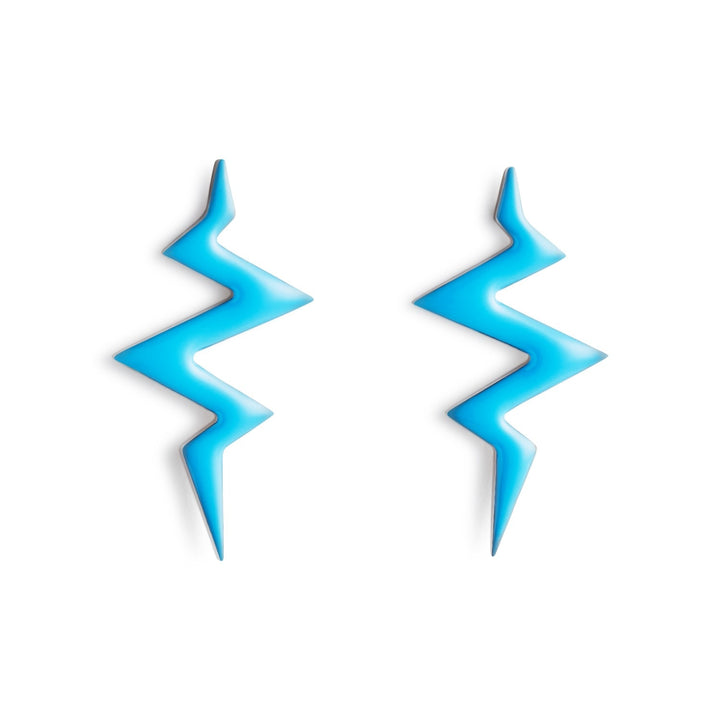 These earrings are crafted from dark stainless steel and coated with sky blue enamel. They are a scaled-down version of the original design.