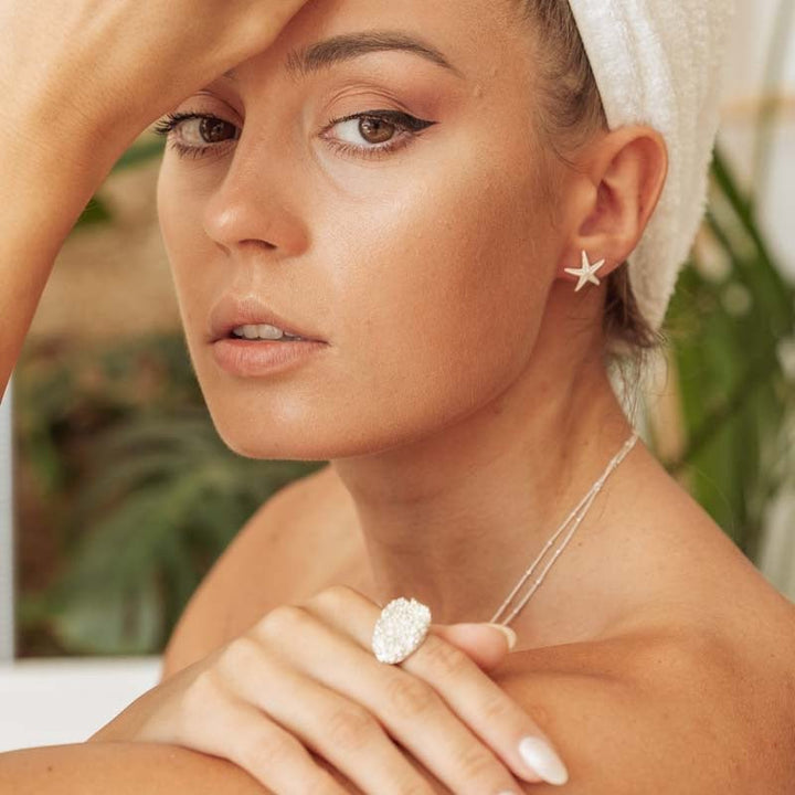 These Dainty Silver Starfish Studs by Dainty London are a charming accessory that adds a touch of ocean-inspired beauty to your everyday look. Part of the Cornish Coastal Collection, these studs are modeled after a dried starfish found on a beach, celebrating the designer's love for the sea. Crafted from eco-friendly recycled sterling silver, these earrings are perfect for sea lovers and are a subtle, elegant reminder of the beauty of the coast.