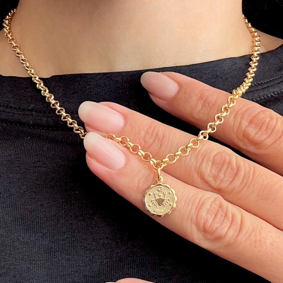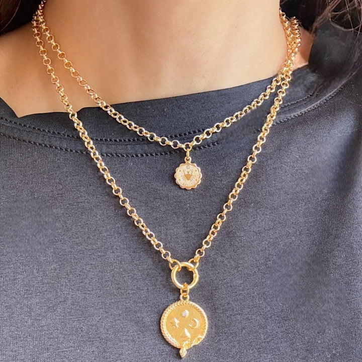 This necklace is crafted with a gold-filled medallion and a rolo chain. It is adjustable from 15-17" in length.
