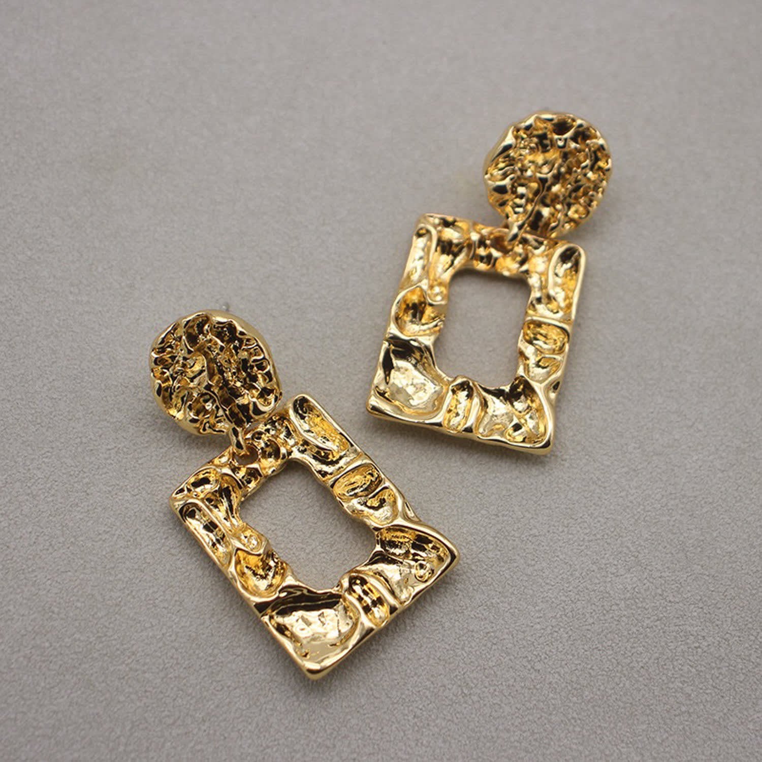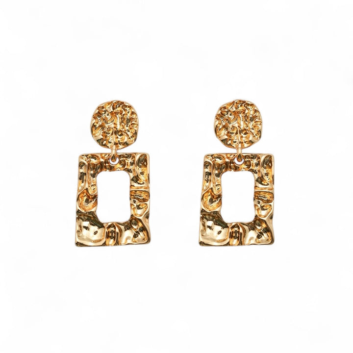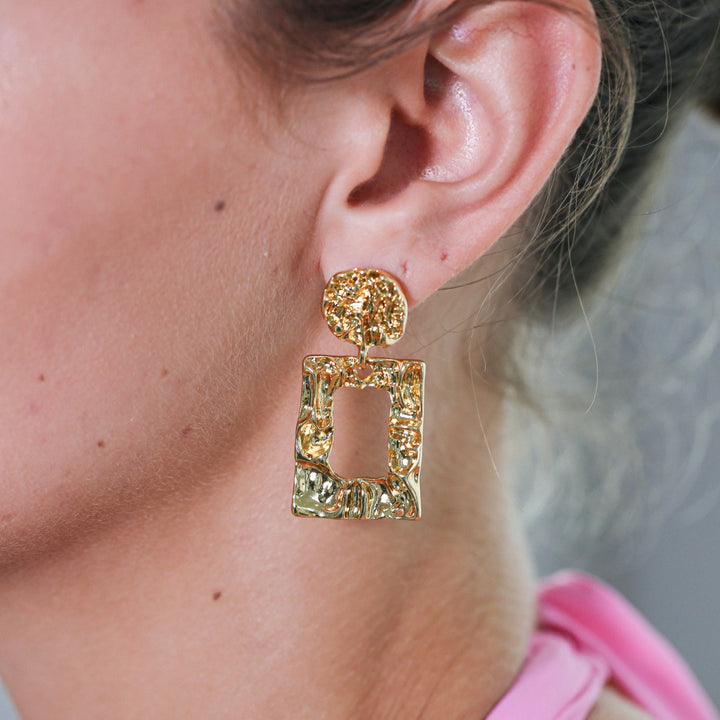 These Gaia Drops by Miss Cecilia are bold sculptural earrings inspired by abstract modernism. Their textured square form and gold shine create a contemporary edge, perfect for transforming everyday or evening ensembles into statement looks.