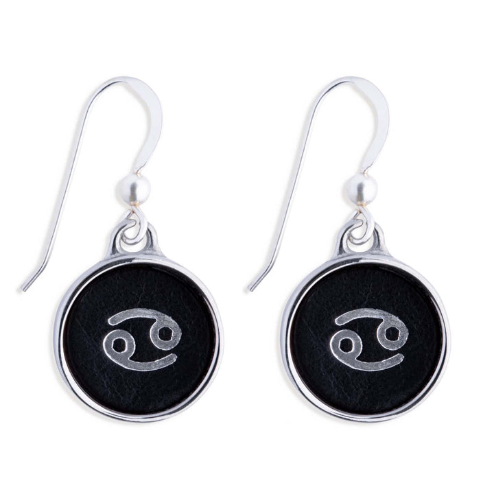 These earrings are crafted from 100% cow leather and a stainless steel cabochon with 100% recycled sterling silver ear wires. They feature a circular leather piece embossed with a silver foil Cancer zodiac star sign.
