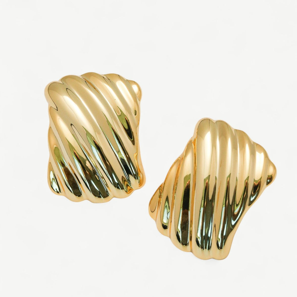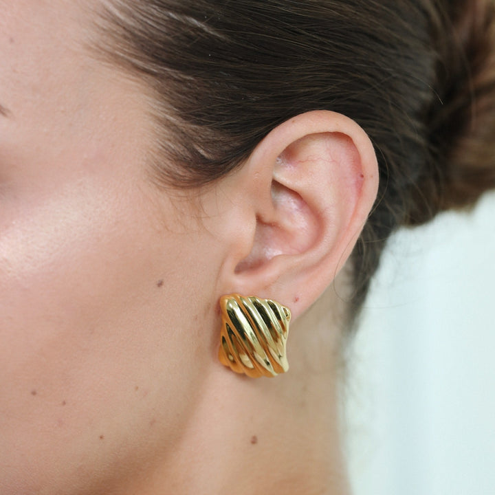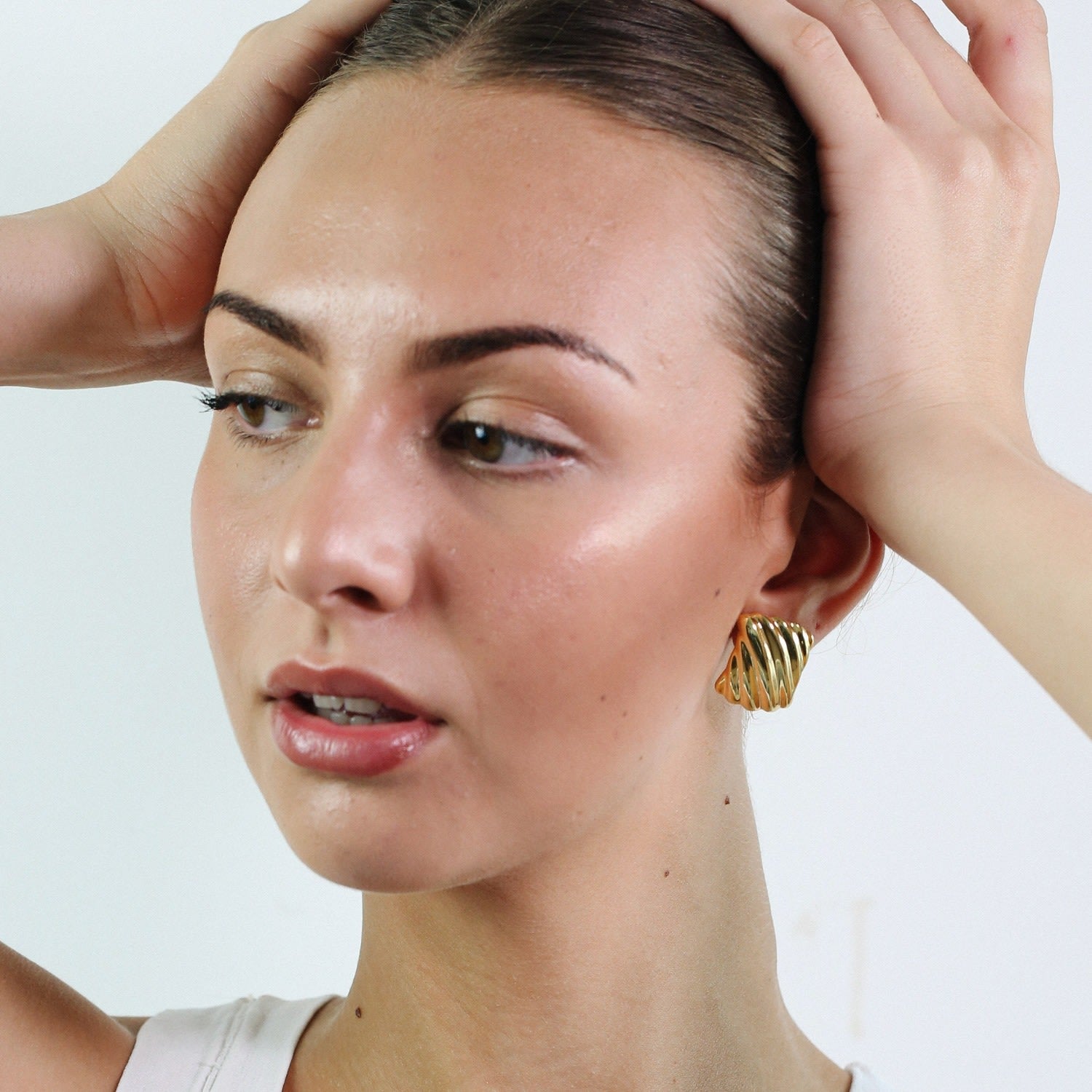 These Oversized Wave Stud Earrings by Miss Cecilia combine modern chic with a minimalist design. They are crafted with 18ct gold plating on durable brass and feature a bold, fluid wave shape. These versatile earrings are perfect for both everyday wear and special occasions, elevating any outfit with subtle sophistication.