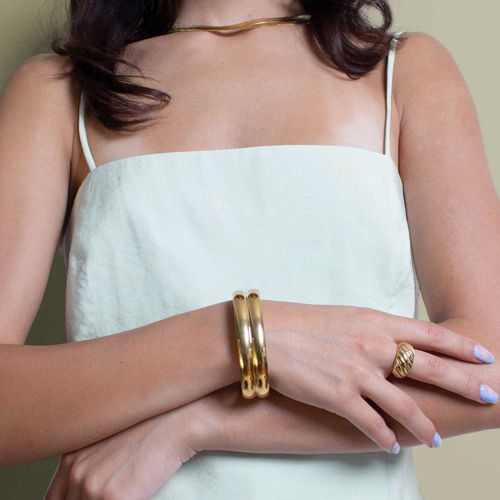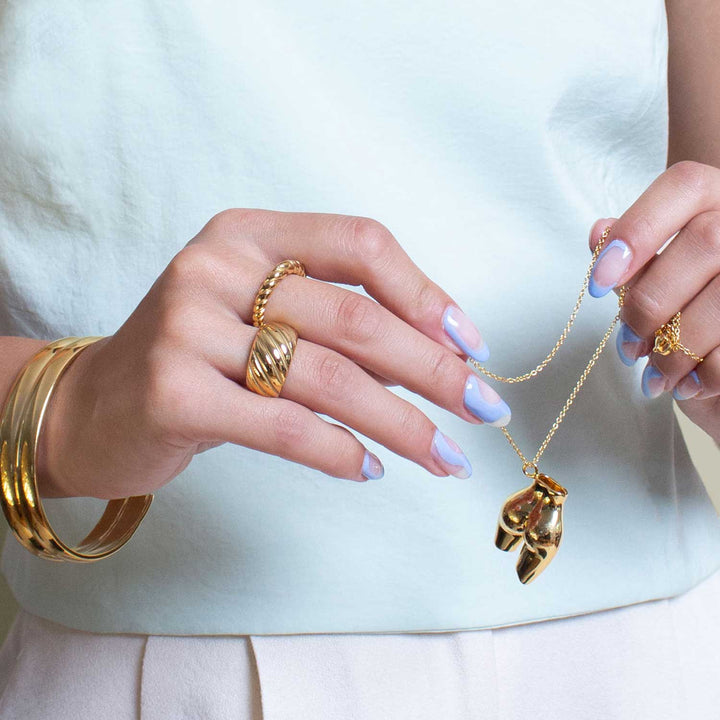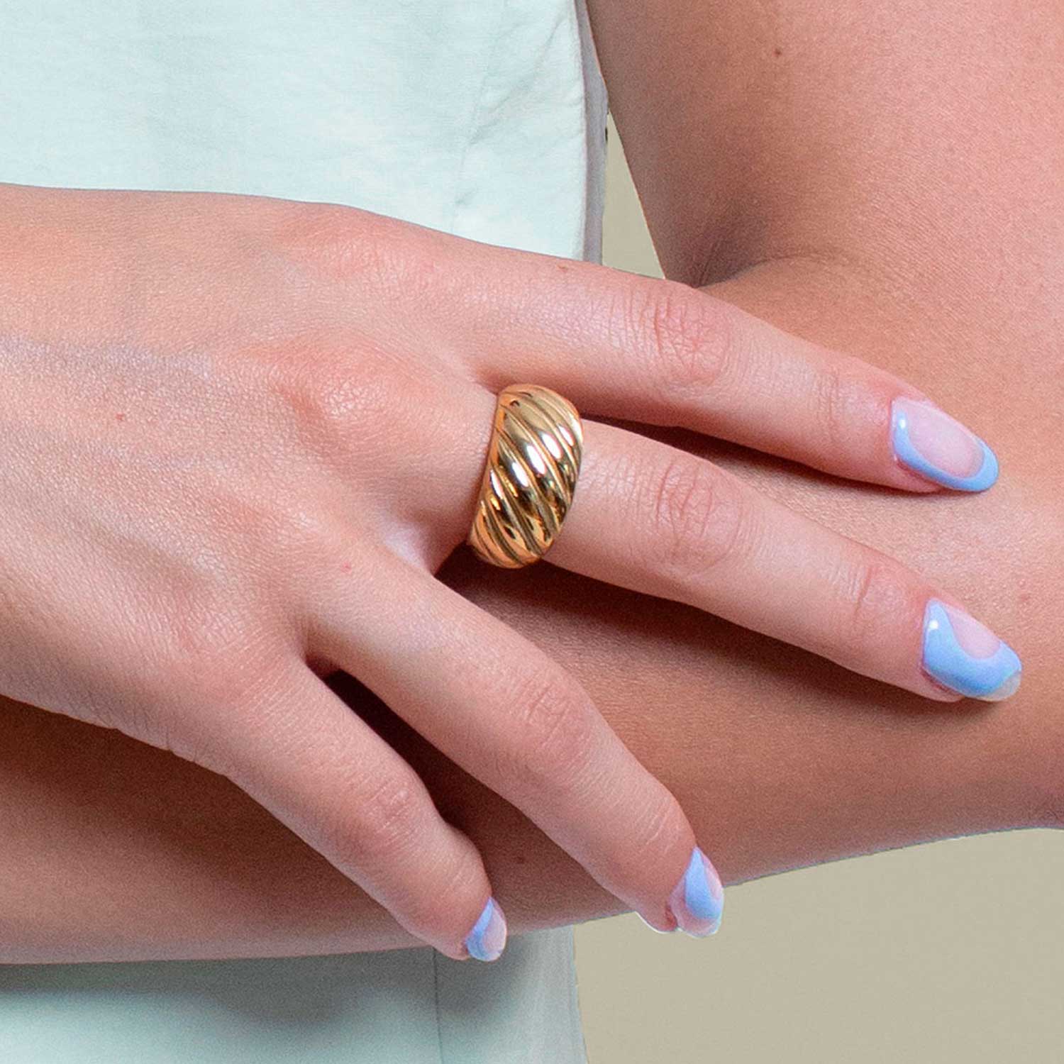 This Deco Vintage Inspired Gold Bold Statement Ring by Outofoffice is a chunky dome ring that masterfully blends a nostalgic design with a modern edge. Meticulously handcrafted, its bold curves and subtle detailing add effortless sophistication to any look. This ring is a timeless piece that makes a statement, whether stacked or worn solo. Its tarnish-free and waterproof nature ensures it will elevate your style with ease for years to come.