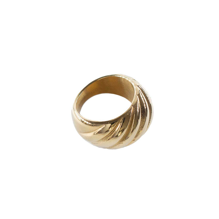 This chunky dome ring is handcrafted from an unspecified, tarnish-free, and waterproof material. The band measures 12mm wide.