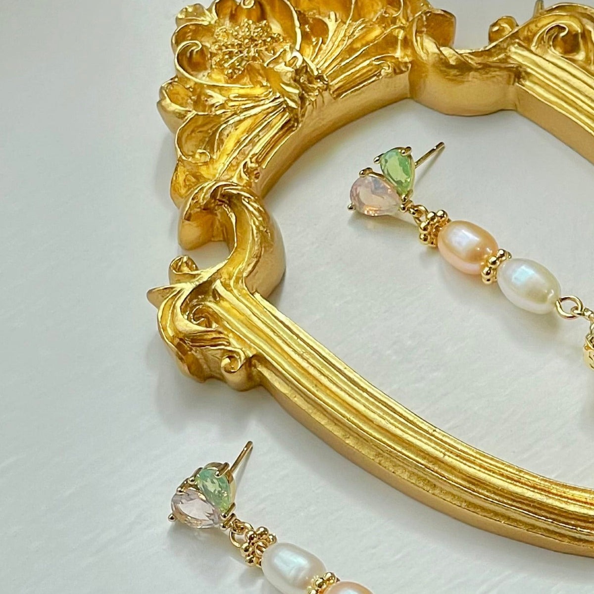 These earrings are made of 925 silver, zircon stones, pearls, and gold-plated brass.