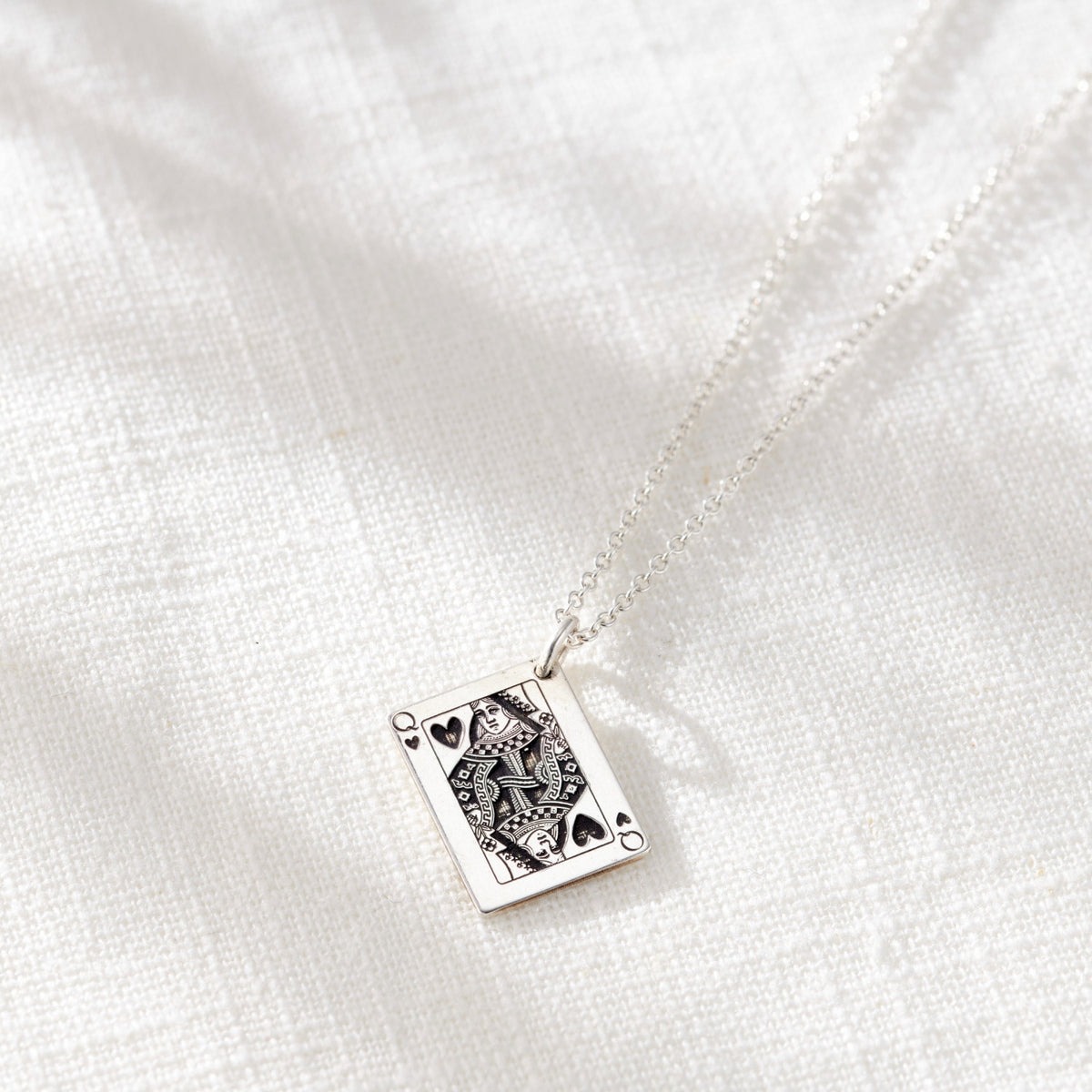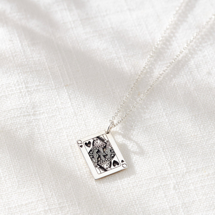 This Queen of Hearts Playing Card Charm Necklace by Posh Totty Designs celebrates love and luck. Hand-engraved details bring the playing card motif to life, creating a thoughtful keepsake or heartfelt gift. Whether worn as a personal talisman or a playful statement, it adds charm and meaning to everyday style.