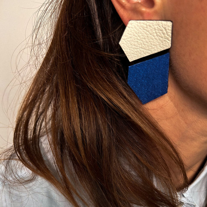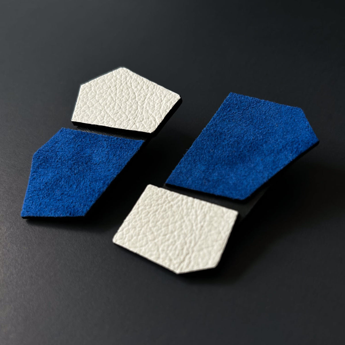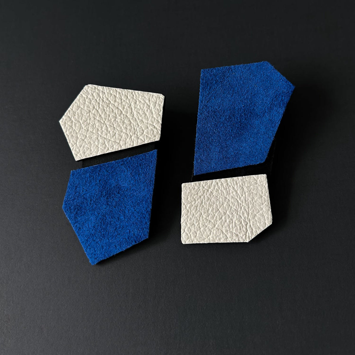 These Angl Leather Earrings Blue by Waiwai are a unique accessory with asymmetrical design. These lightweight earrings are cut by hand from leather and layered with contrast, balancing sharp edges with a soft finish. They are geometric but never rigid, offering an unexpected yet effortless style. They are a statement piece that shifts between structure and movement.