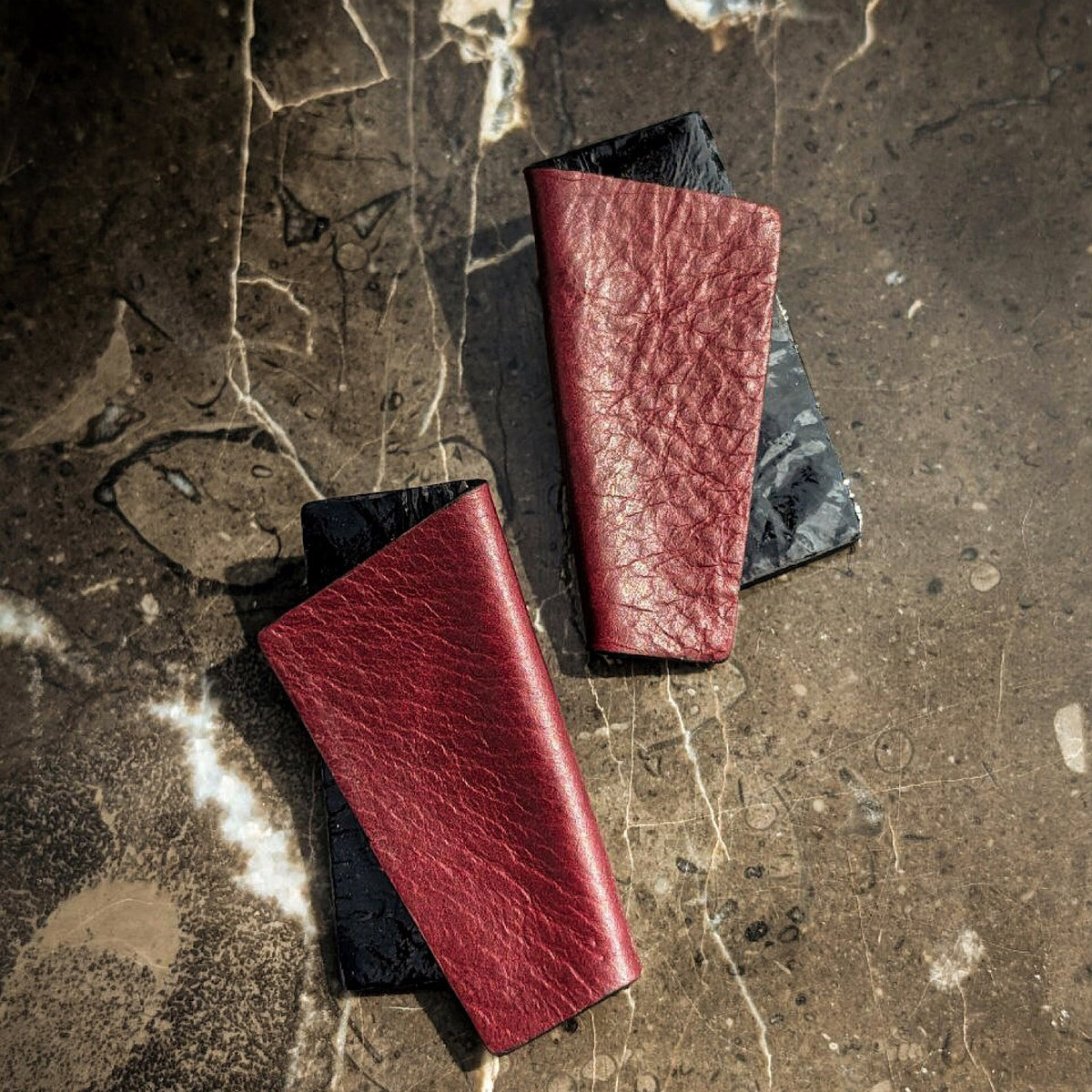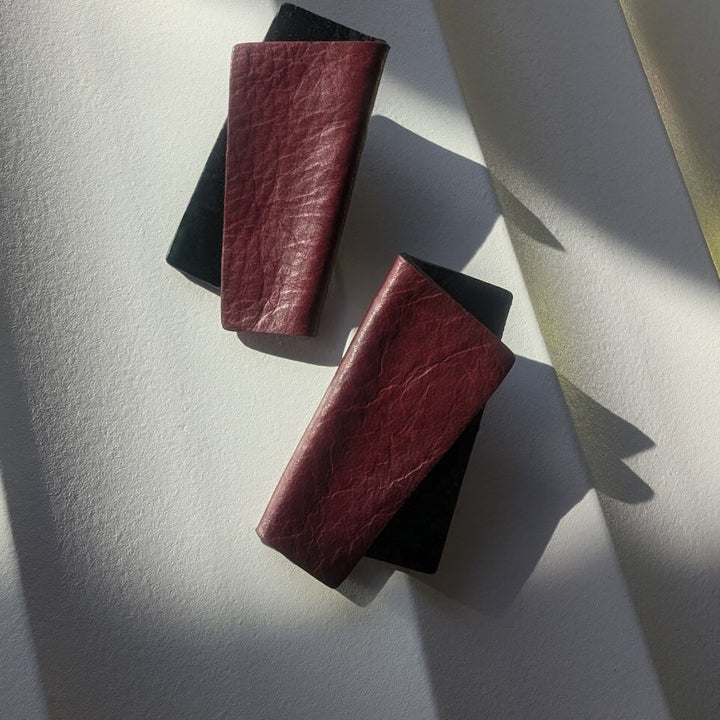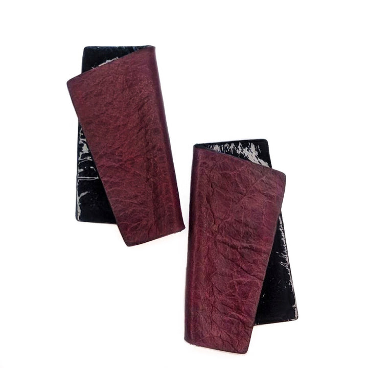 These Verto Burgundy Leather Earrings by Waiwai are a bold and simple accessory. Handcrafted from ethically sourced leather, they feature an overlapping fold design that adds dimension and texture. The deep burgundy hue is contrasted against a subtle lacquered black interior. They are lightweight and versatile.