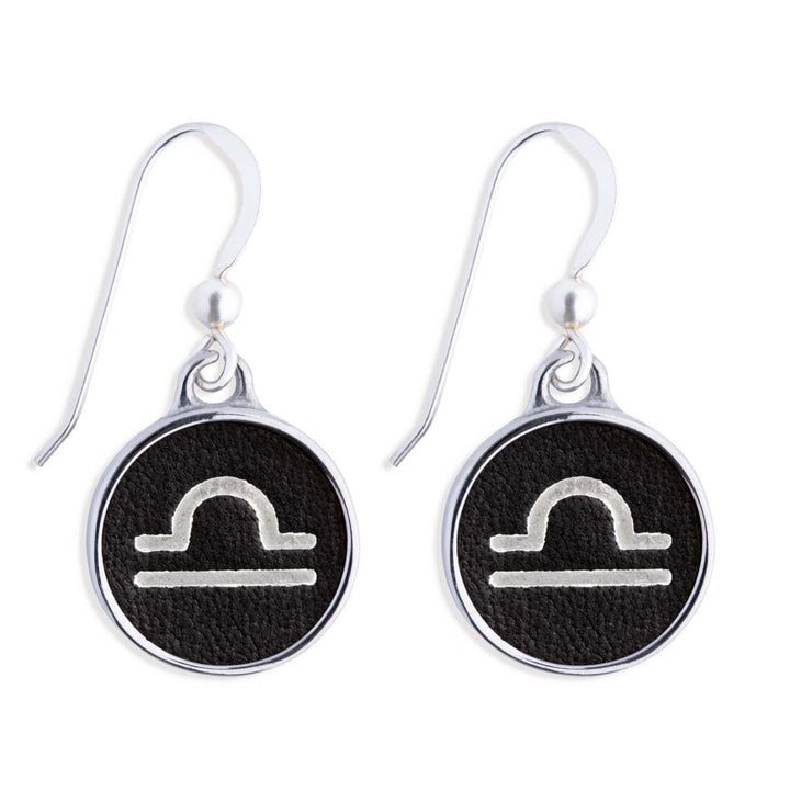 These earrings are crafted from 100% cow leather and 100% recycled sterling silver ear wires, featuring a stainless steel cabochon with a silver foil-embossed Libra zodiac sign.